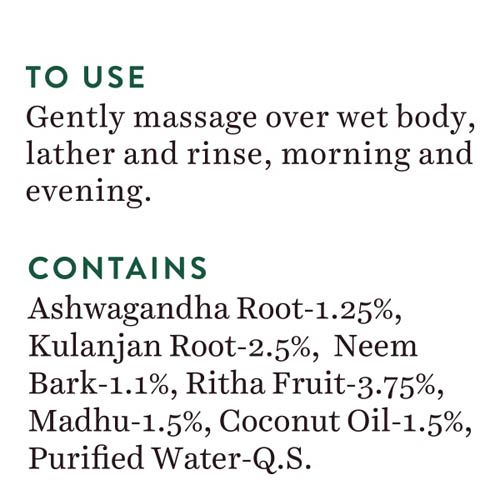 | DESCRIPTION This fresh-foaming, 100% soap-free gel is a blend of pure honey, winter cherry, galangal, coconut oil and soap nut, to cleanse and help brighten skin for a fresher, fairer, body finish. Lathers into rich suds that rinse off completely, without disturbing the skin’s natural pH balance. | | INGREDIENTS Ashwagandha Root, Kulanjan Root, Neem Bark, Ritha Fruit, Madhu, Coconut Oil, Purified WaterQ.S. | | BENEFITS Ashwagandha Root, Kulanjan Root, Neem Bark, Ritha Fruit, Madhu, Coconut Oil, Purified WaterQ.S. 1. Organically pure & preservative free 2. Dermatologist tested for safety 3. No animal testing | | HOW TO USES Gently massage over wet body, lather and rinse, morning and evening. | Country of Origin: India Name of Mfg / Importer / Brand: Bioveda Action Research Company Address of Mfg / Importer / Brand: 42, Rampur Ghat Rd, Paonta Sahib, Himachal | | |