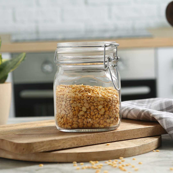 The Bormioli glass jar containers feature a high-quality, multipurpose, clear round design, ideal for storing kitchen supplies from spices, herbs to tea, coffee. You can even use it to store paper clips, bath salts and much more. The stainless steel buckle is adaptable, and helps in providing an air-tight secure seal preventing any leaks and helps to keep the contents fresh. A wide opening makes filling the jar and dispensing the contents very easy and avoids spillage.