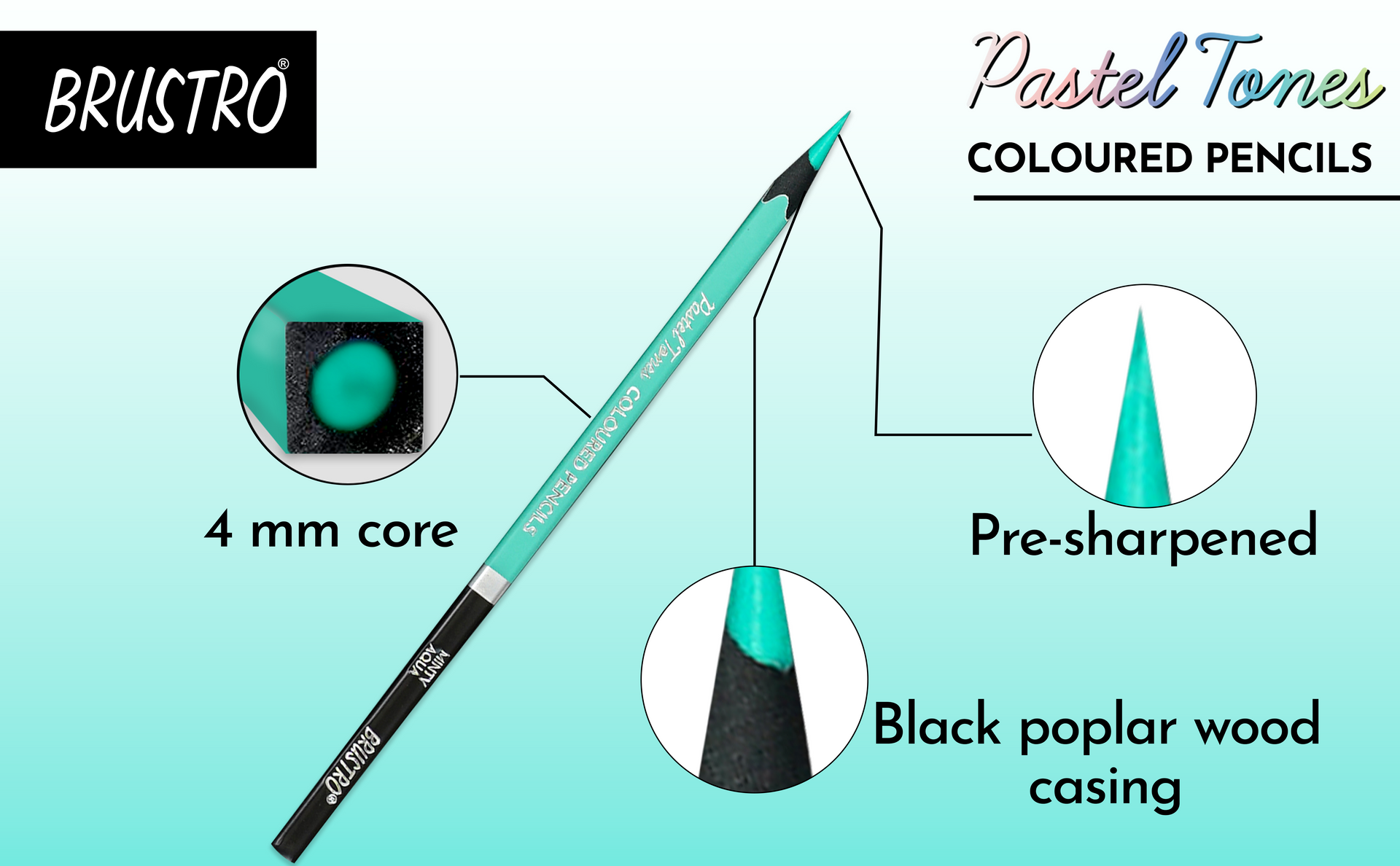 - Brustro Set of 36 Pastel Tone Colour Pencils is a sophisticated collection of muted tones colour pencils, housed in a premium tin box packaging that adds a touch of elegance. These exquisite colour pencils are encased in a special black poplar wood, elevating the aesthetic appeal and ensuring durability.