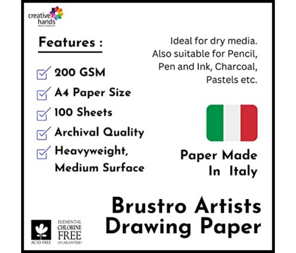 Sketching & Drawing papers are made of high-quality lignin-free and acid-free cellulose, guaranteeing long conservation over time. Produced with 100% of E.C.F. pulp (Elemental Chlorine Free). Its internal and external sizing renders it resistant to repeated erasures. It is recommended for artists and amateurs for sketching and drawing with pencil, charcoal, pastel, coloured pencil and ink. It is also suitable for gouache. Brustro is a registered trademark of Creative Hands Art Materials Pvt. Ltd.