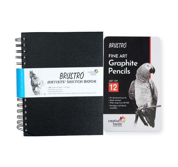 BRUSTRO Artists ’ FINEART Graphite Pencil Set of 12 (10B-2H), with Wiro Bound A5 Size Artists Sketch Book, 120 Pages, 160 GSM