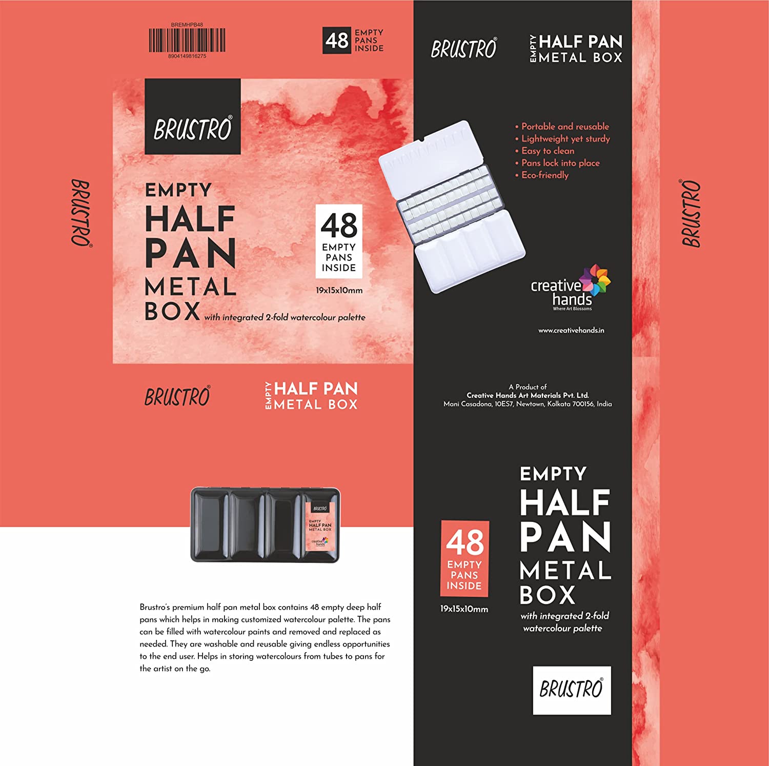 Includes 48 empty half pans which are detachable Each pan can hold upto 2ml of watercolour paint. Sturdy, reusable metal box. Black enamel exterior and white enamel interior. Foldout palette attached as the inner lid. Metal ring under the box to give a proper grip.