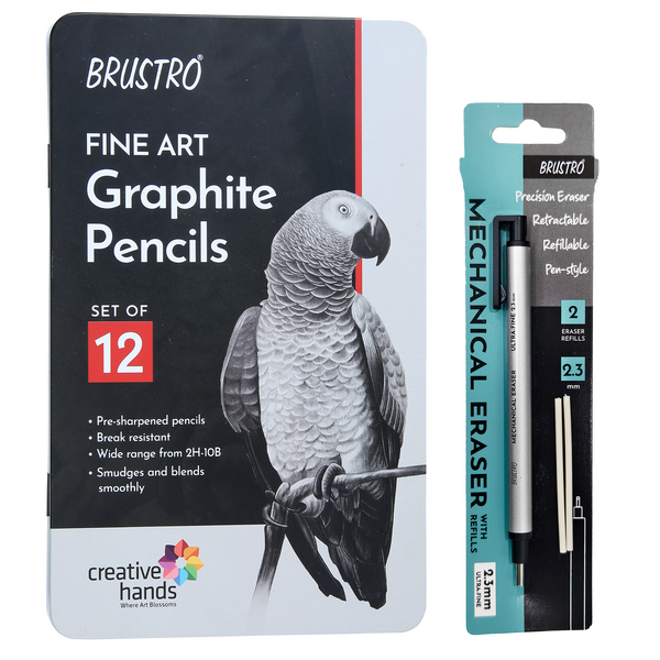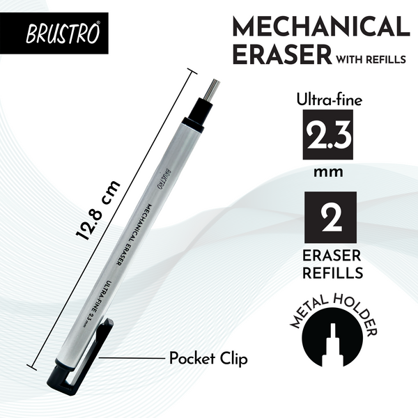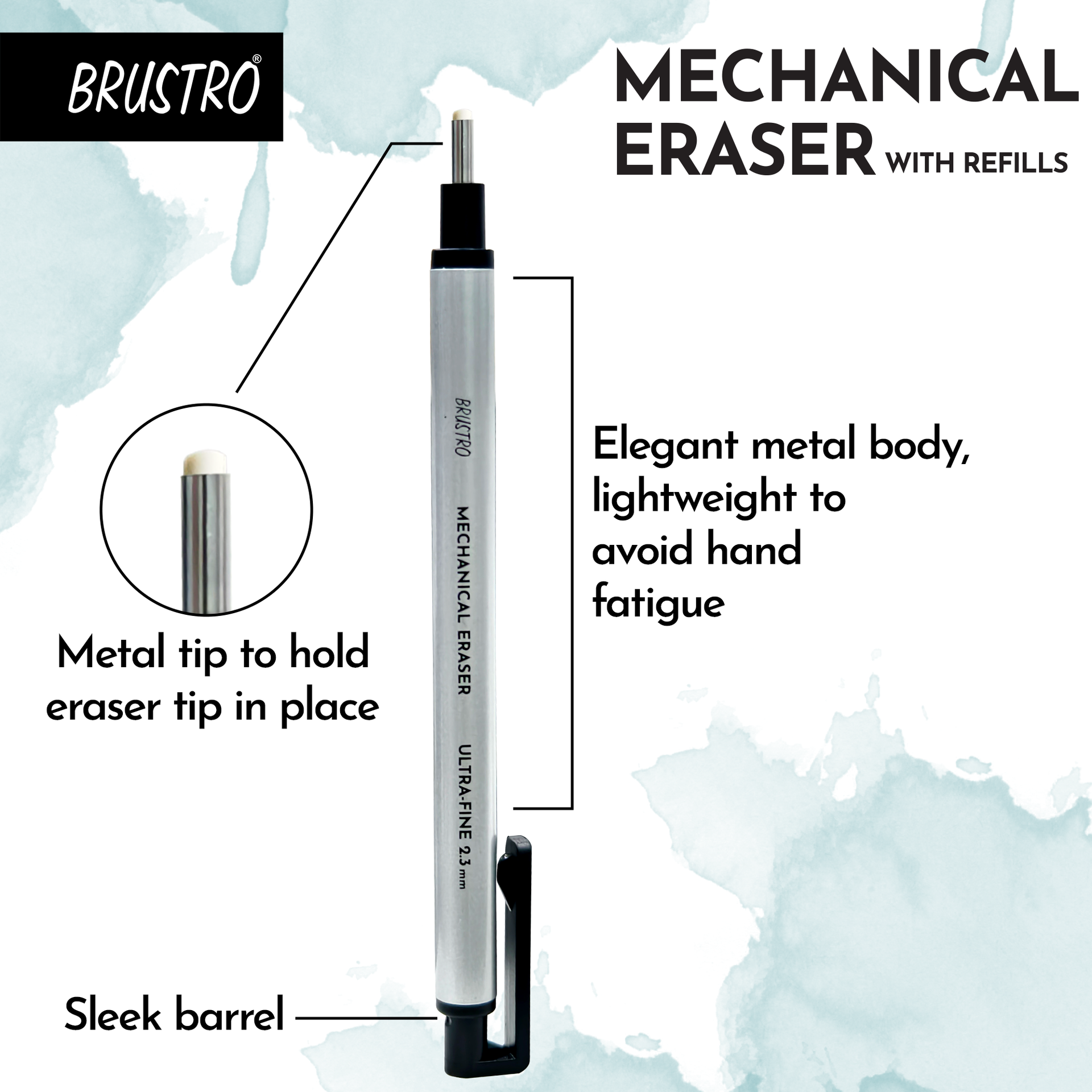 The Brustro Mechanical Eraser 2.3 mm is a precision tool designed for artists, architects, and designers. This pen-style eraser offers ultra-fine, clean, and consistent erasing, perfect for creating highlights in charcoal, graphite, soft pastel, and coloured pencil artwork. The retractable, refillable design ensures convenience and long-lasting use. Equipped with two extra soft, non-abrasive eraser refills, this mechanical eraser delivers smooth results without damaging the paper surface. Its sleek, metal body is lightweight to prevent hand fatigue, while the metal tip holds the eraser securely in place. The compact design, complete with a pocket clip, allows for easy portability, making it an essential addition to any artist’s toolkit.