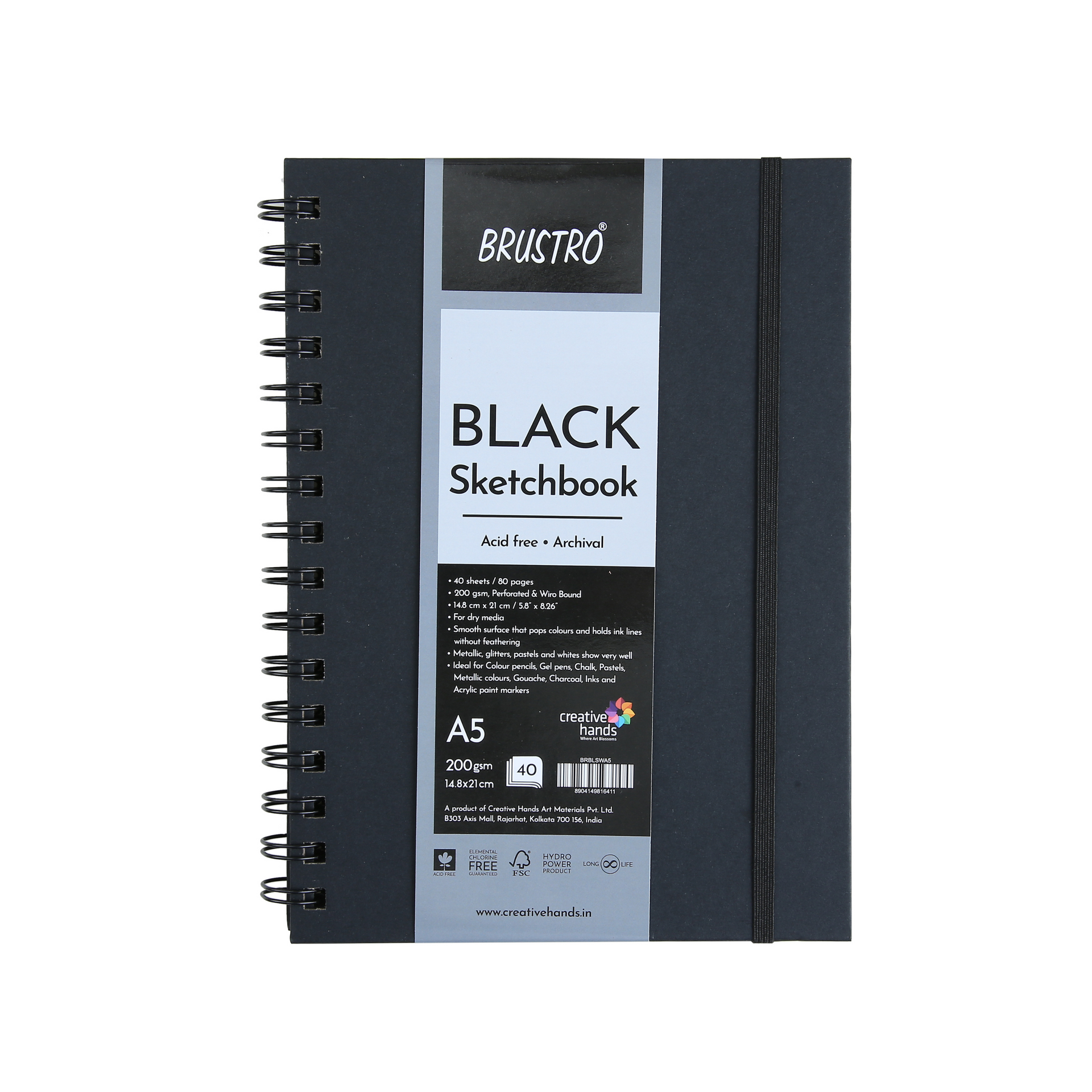 Brustro Black Sketchbook, Wiro Bound, A5,200GSM (40 Sheets)80pages-Ideal for coloured pencils, gel pens, chalk, pastels, metallic colours, gouache, charcoal, inks and acrylic paint markers, Metallic, glitters, pastels and whites show very well.