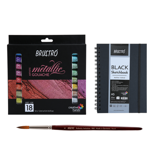 Brustro Artist Metallic Gouache comes in a set of 18 unique, shimmering metallic shades to add highlights and reflective qualities to your artworks in 12ml tubes