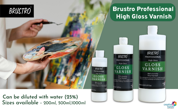 Bring out the true brilliance of your artwork with BRUSTRO Professional High Gloss Varnish. Specially formulated for artists, this varnish imparts a striking high-gloss finish that enhances color depth and vibrancy, making your creations stand out with a reflective sheen. Its advanced formula dries quickly to a crystal-clear, non-yellowing surface, ensuring your artwork maintains its original beauty over time. Ideal for use on both acrylic and ings, this varnish also provides a protective layer against dust, dirt, and UV rays, preserving your work’s integrity. Whether you’re a seasoned professional or a passionate hobbyist, BRUSTRO Professional High Gloss Varnish is essential for achieving a polished, museum-quality finish on your masterpieces. Conveniently packaged in a 500 ML bottle, it’s perfect for a range of projects, large or small.