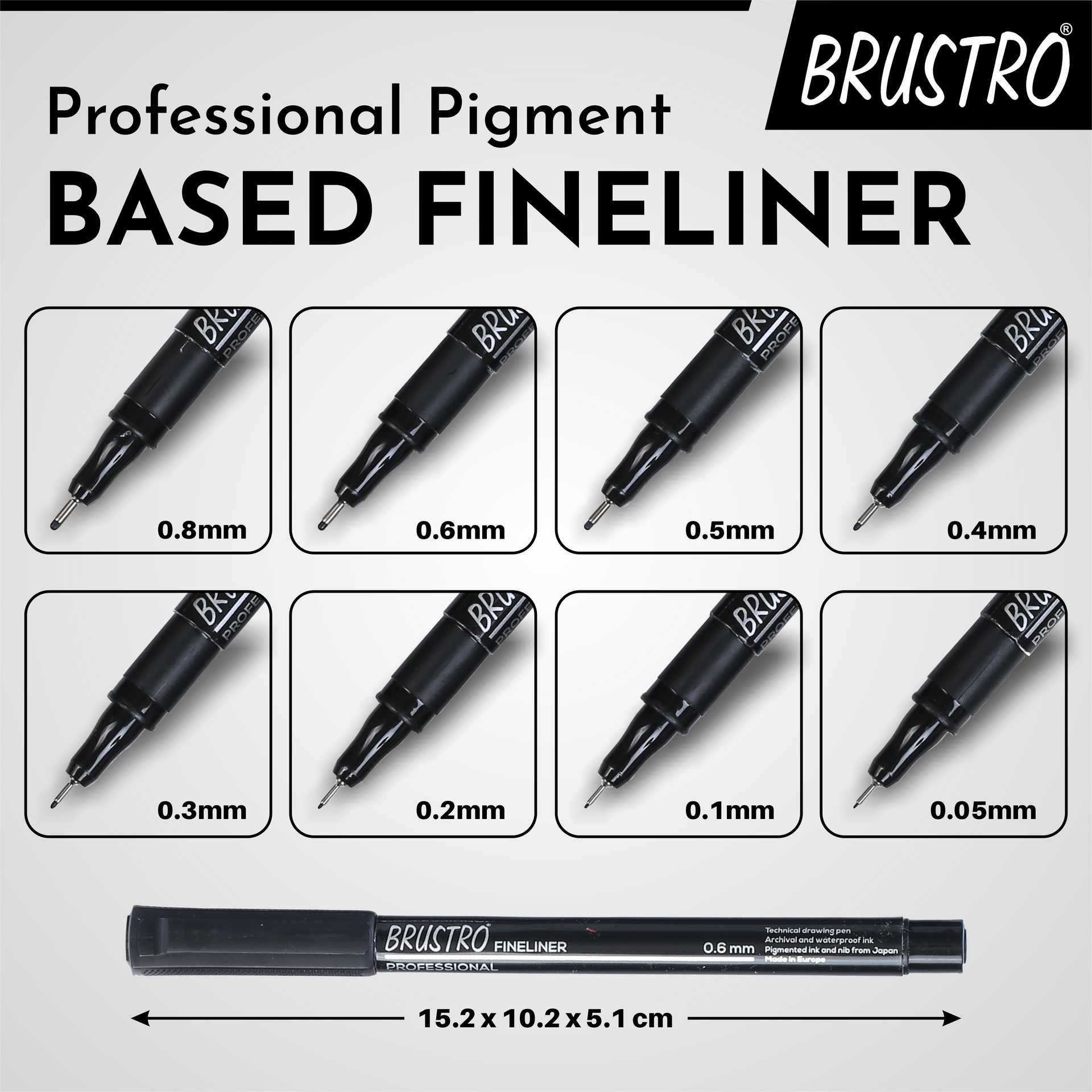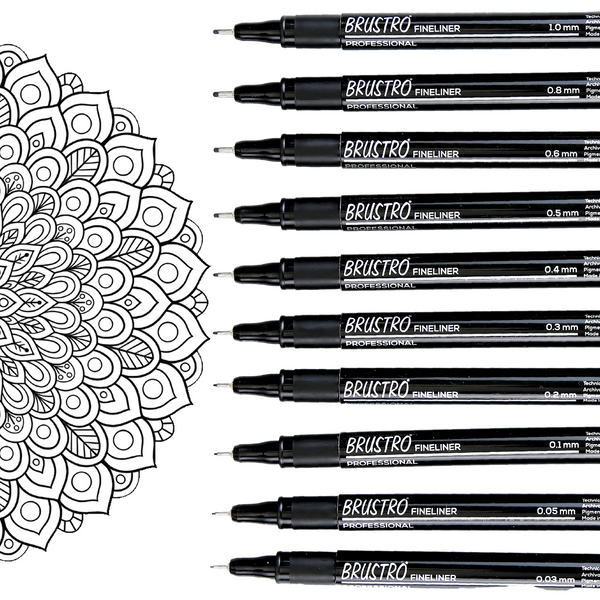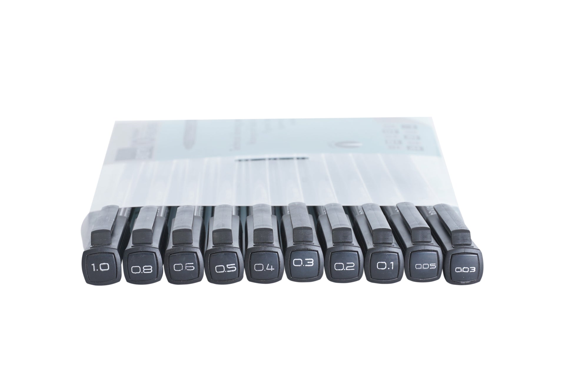 This set contains 10 fineliners which include: 0.03/0.05/0.1/0.2/0.3/0,4/0.5/0.6/0.8/1 mm (in black ink).