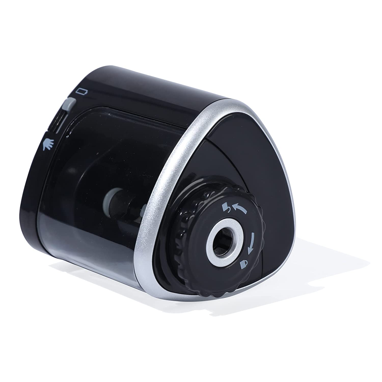 Works both with battery and manual mechanism. Sturdy and aesthetic. Fits pencils with diameter 6-8mm. Gives sharp points in seconds. Runs on 2 AA batteries (not included). Auto -manual switch to change mode of sharpening. SK2 blade gives sharp and durable point. Replaceable blade included. Large transparent shaving bin. Non -skid rubber feet.,