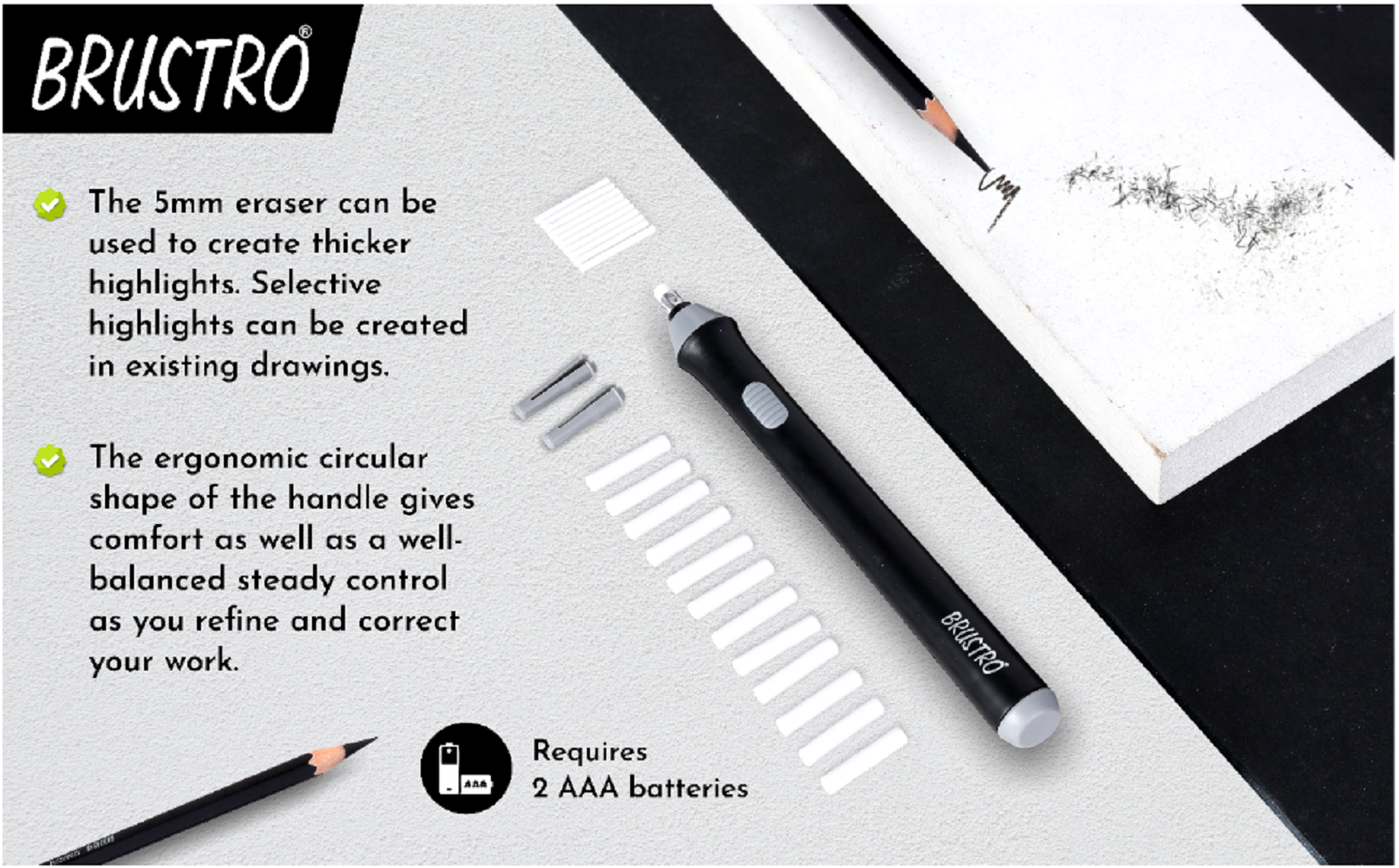 An ideal tool for artists, professionals Note: Requires 2 AAA batteries. Batteries not included. you will have to purchase the battery separately from the market, to use this eraser.Â.SKU-BRSBOE