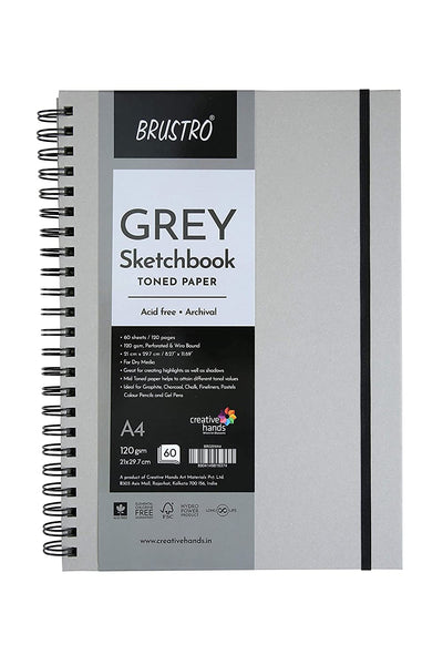 BRUSTRO Toned Paper - Grey Sketchbook | A4, 120 GSM | 60 Sheets/120 Pages | Wiro Bound, Spiral, Premium, Acid-free Paper, Ideal for Dry media, Mandala Art, Graphite, Charcoal, Colour pencils, Gel pens