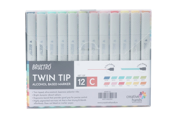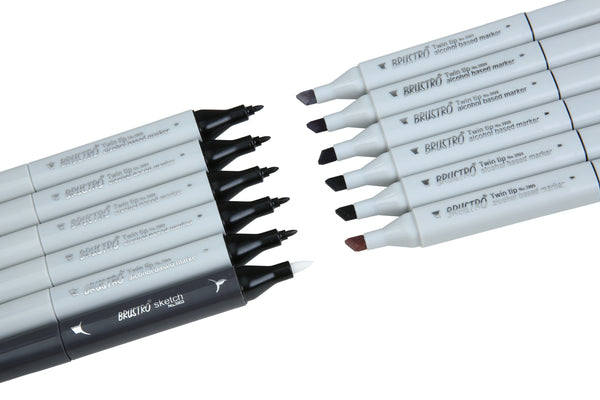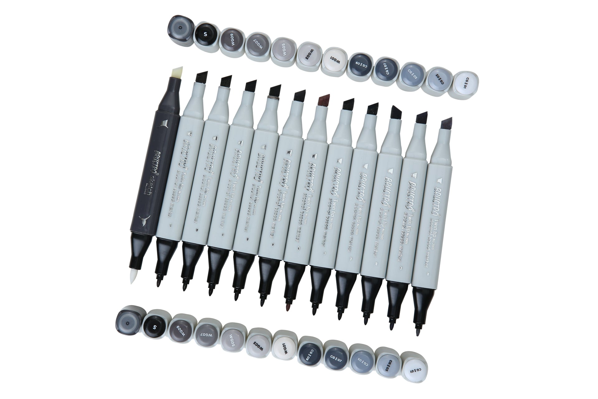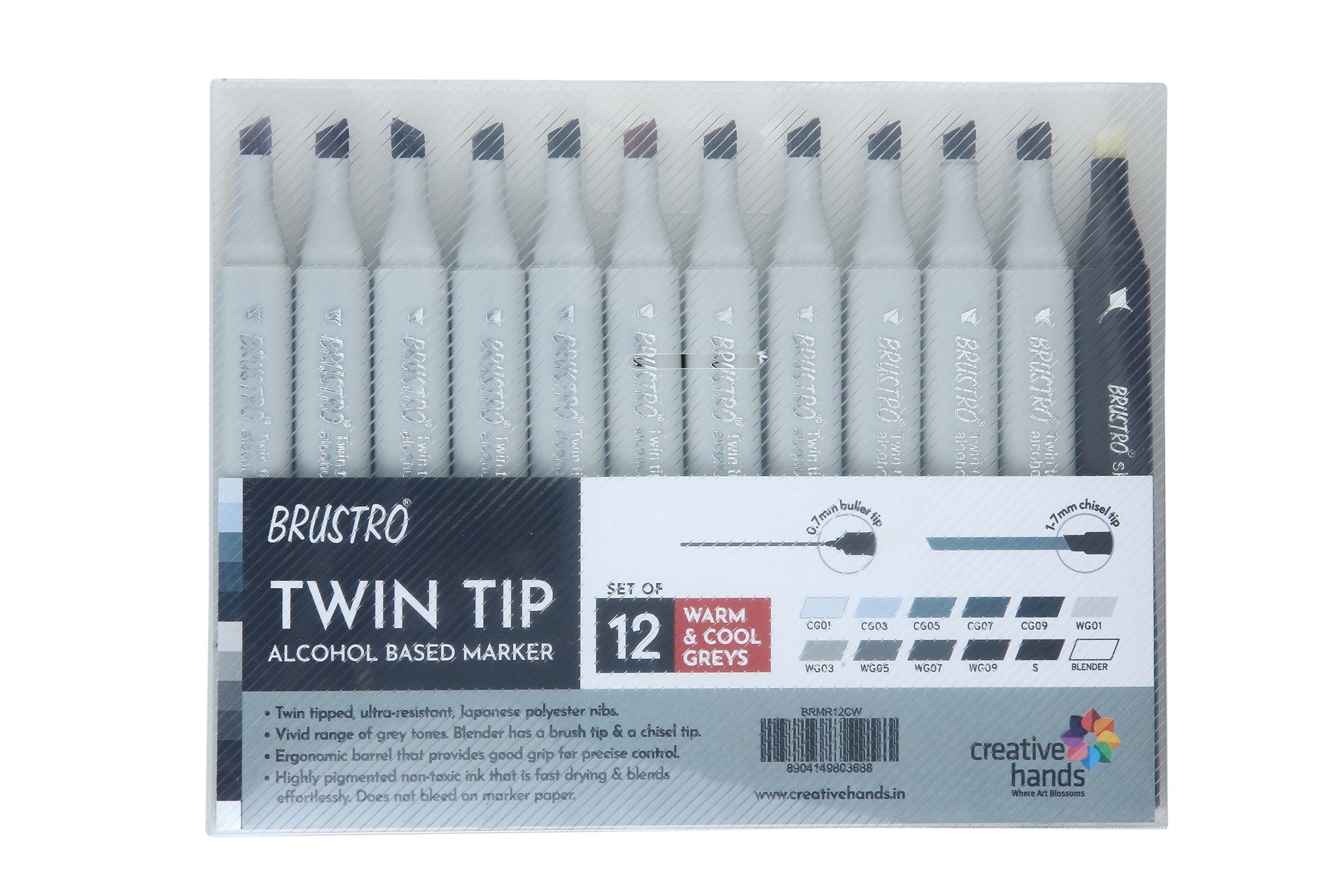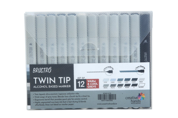 - BRUSTRO Twin Tip Alcohol Based Marker Set of 12 Cool & Warm Grey Shades in Crossline PP See Through Box