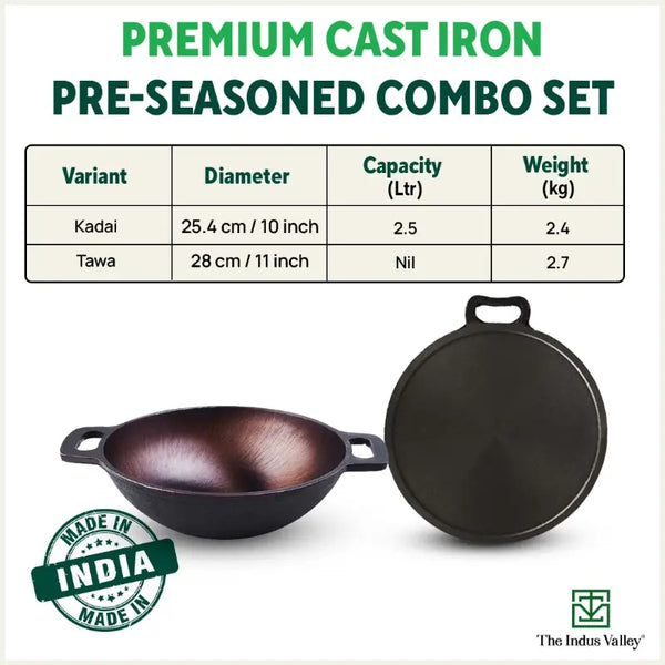 🍳COOKS ALL YOUR FAVOURITE DISHES: The pre seasoned cast iron tawa is for dosa, roti/chapathi, paratha, omelette, etc. Whereas the cast iron kadhai is good for making sabzi, dal, paneer masala, samosa, etc.