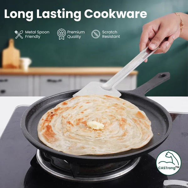 π―STRONG BUILD: Cast iron is a great alternative for non-stick cookware as it is sturdy and durable. The heavy surface can resist damage, bulging, and dents. You donβt have to worry about using metal spatulas anymore!Β