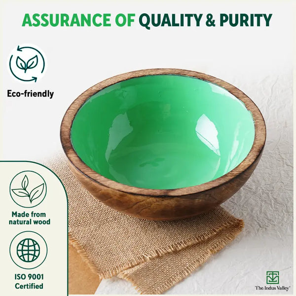 The Indus Valley Ceramic Glazed Mango Wood Bowl is made of natural wood that is 100% food-safe. The premium quality wooden bowl has a wide interior with a glossy, food-grade ceramic surface.