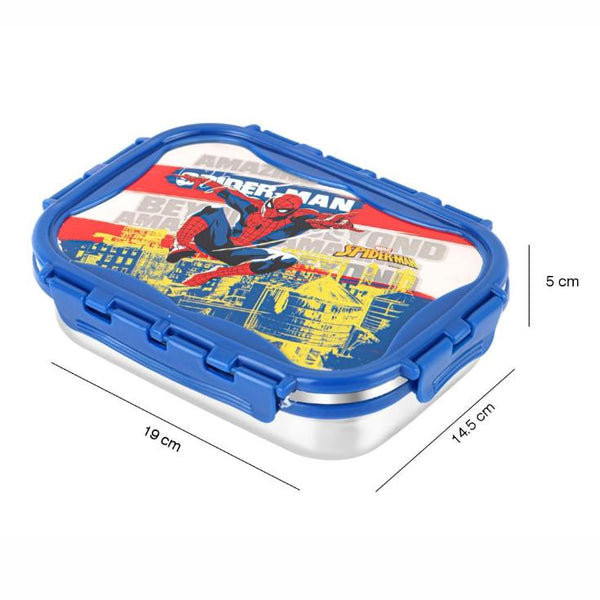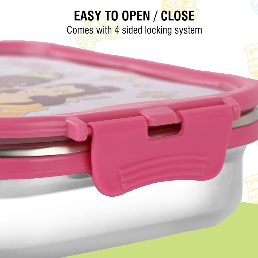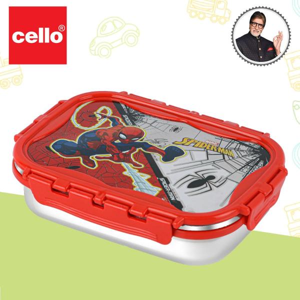 Introducing the Cello Kidzbee Click It Toons Stainless steel Lunch Box – a dynamic mealtime companion for kids! A compact lunch box with kiddie prints, durable stainless steel material, and vivid colours that is perfect for school, picnics, and camping. The lightweight design fits easily in backpacks, while side locks and an airtight lid keep food fresh and secure. Inside, a leakproof steel container accommodates gravies and snacks. Stylish, functional, and safe, the Cello Kidzbee Click It Toons Lunch Box comes in Red, Blue, Pink and Violet with Disney Princesses and Spiderman making lunchtime exciting for every child.