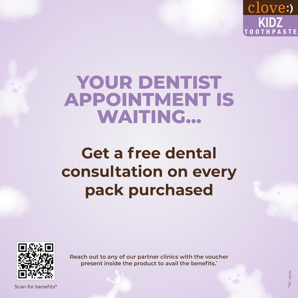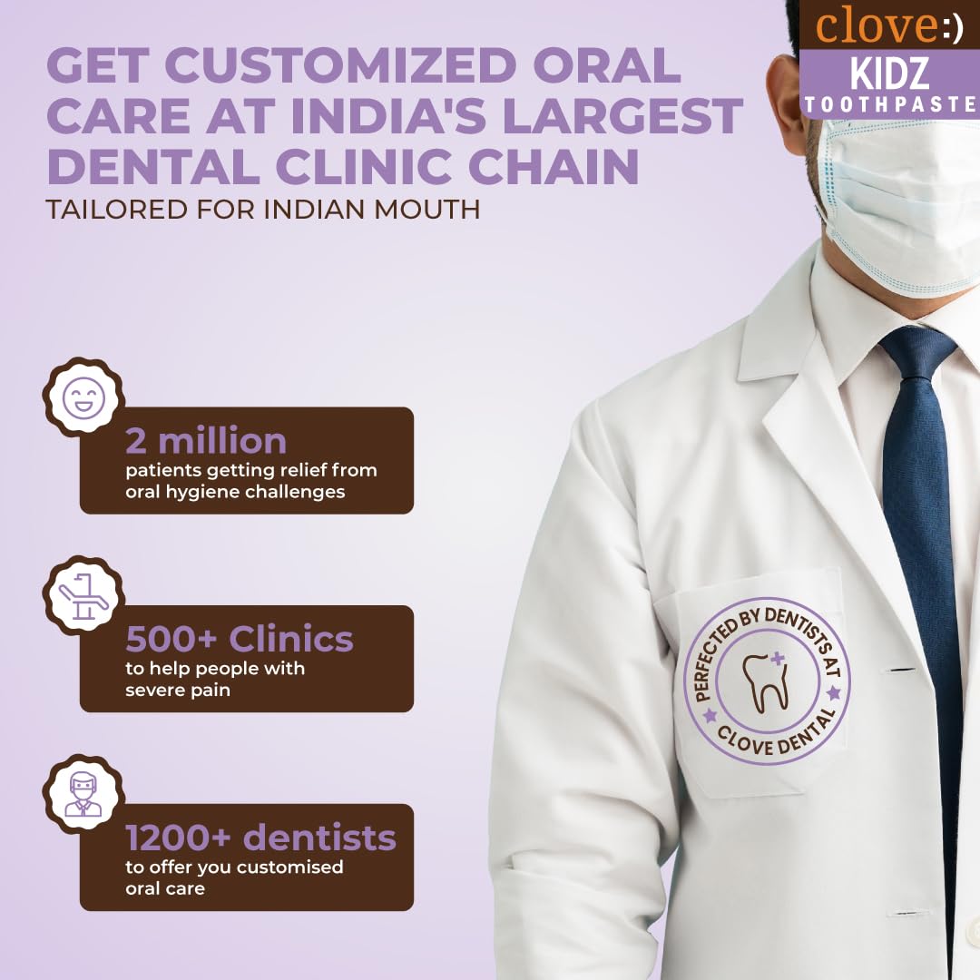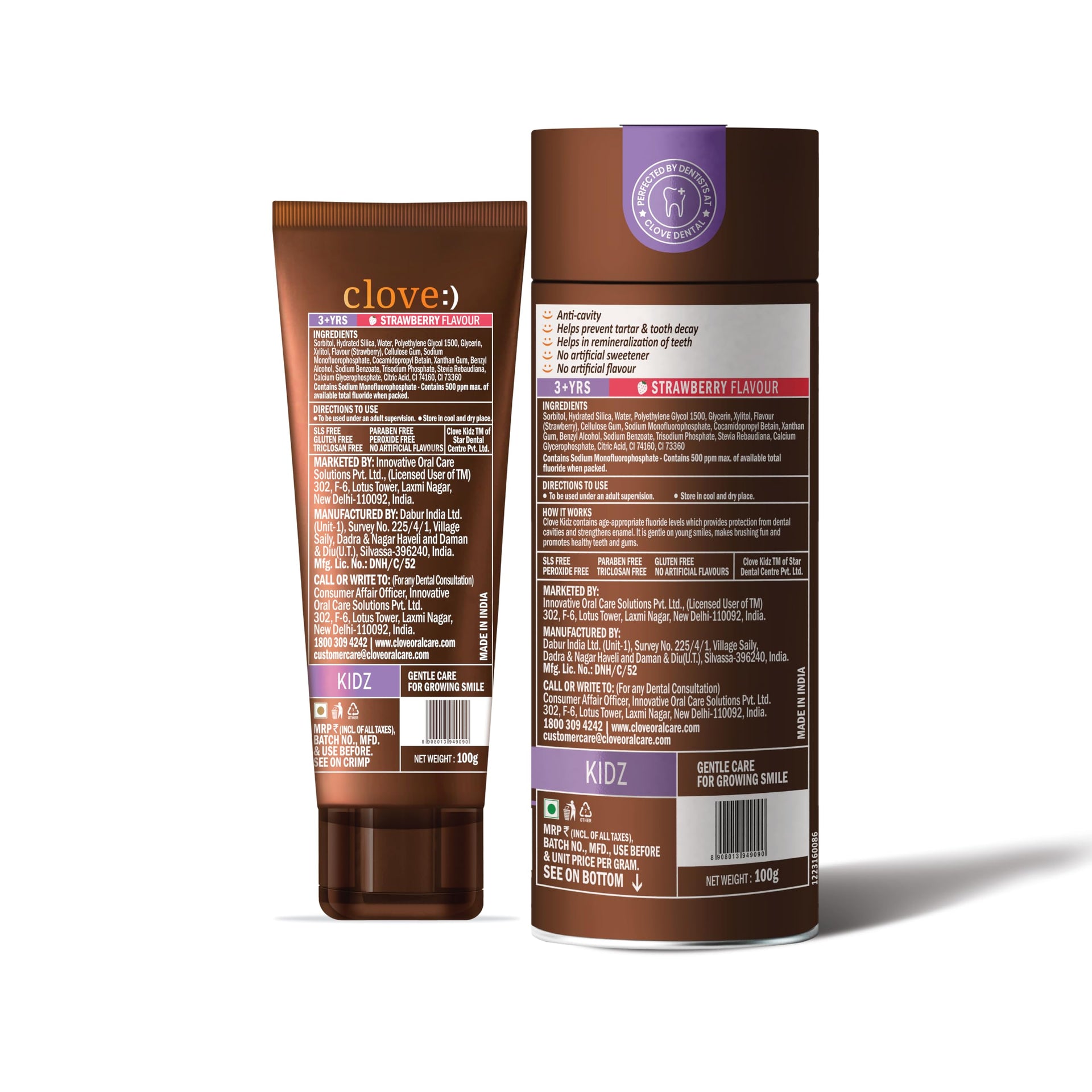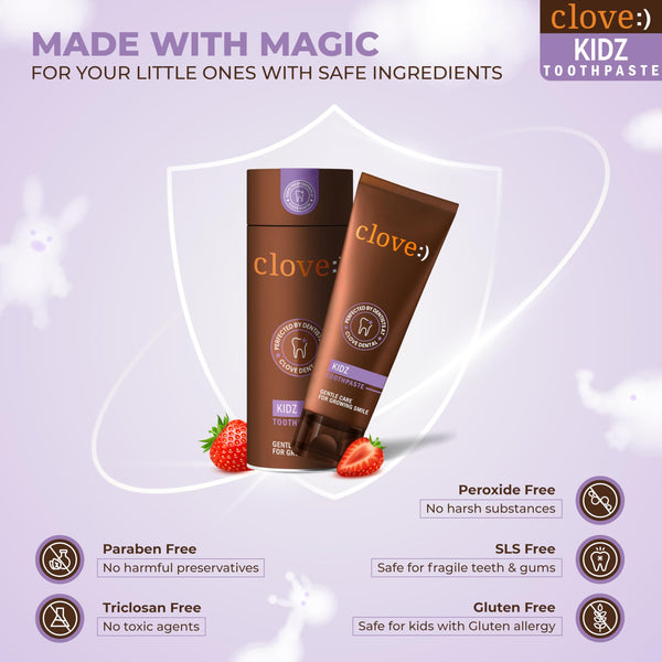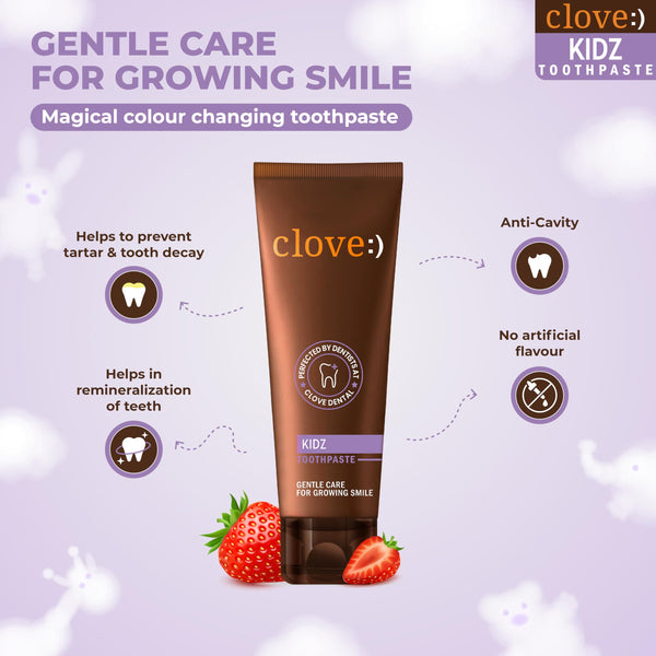 Details: Kids must brush their teeth at least 2 times a day- once in the morning and in the night. Clove Kids toothpaste comes with 0% percent artificial flavors and sweetener so you donβt have to worry about exposing your kid to Unhealthy ingredients. It contains age-appropriate fluoride levels (supervise to minimize swallowing). This delicious natural strawberry-flavored premium toothpaste, specially designed for kids of 3+ years, turns brushing battles into a breeze. Moms often find it difficult to get their little ones to brush their teeth every day, therefore, Clove Kids toothpaste offers a fun way to ensure they enjoy good oral care habits early on! Clove Kids comes In Two Colours Paste That Turns Purple After Two Min Of Brushing Helps Parents To Identify That Brushing Is Complete. It protects against cavities and strengthens the soft enamel of little teeth helping them scoot their way to healthy smiles. Usage Instructions: Brush twice a day under parental supervision. Use a pea-sized amount for supervised brushing to minimize swallowing. Ensure children spit out after brushing.