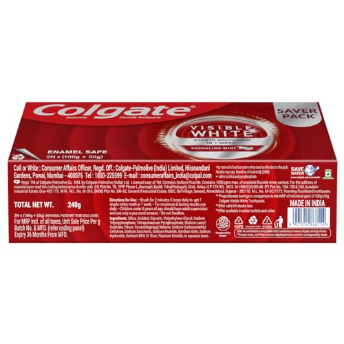 Details: Colgate Visible White is India's Most Used Whitening Toothpaste (as per Kantar World Panel MAT May'22 to June 23 report) that gives you a real white smile starting in 1 week. It's Whitening Accelerators technology gently exfoliates surface stains and polishes teeth surface while protecting your enamel. Apart from the Whitening benefit this toothpaste also offers multiple other benefits like removing yellow stains from your teeth, protecting your teeth against cavities and plaque and freshens your breath. This toothpaste is Gluten-free and completely safe for regular use. This teeth whitening product is made in India. For a better experience try with Colgate Visible White O2 Toothbrush.