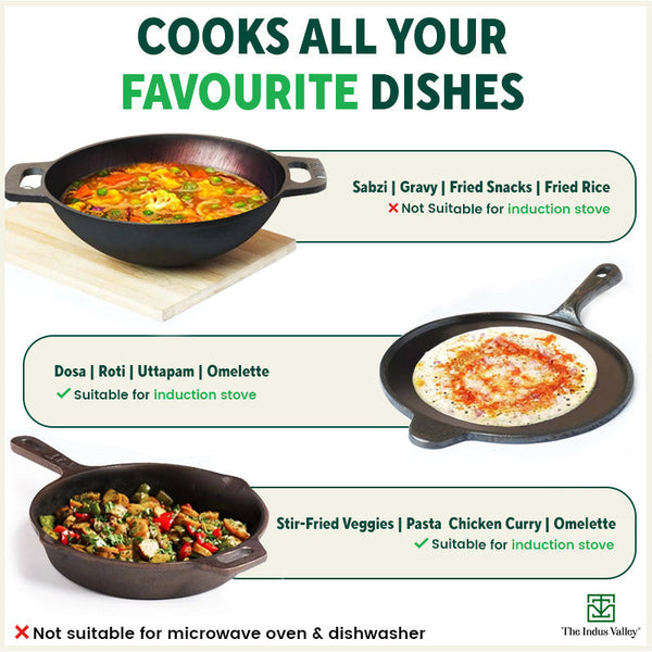 👌MULTI-PURPOSE COOKWARE: The pre seasoned frying pan and tawa works on gas stove, induction, OTG and campfire. (The wok kadai is not induction friendly because of its concave shape.)