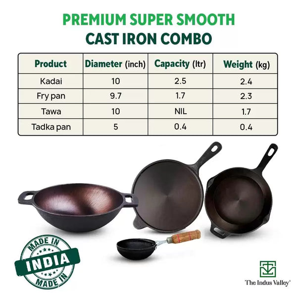 🌿100% NATURAL & TOXIN-FREE: The Indus Valley Super Smooth Cast Iron Cookware Set - Kadai/Kadhai + Long Handle Tawa + Frying Pan/Skillet - is made of 100% natural material that is food-safe and toxin-free.