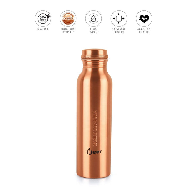 Introducing our Cop-Pura Neer Copper Water Bottle, a 1000ml masterpiece of pure copper craftsmanship. Crafted from 98.99% pure grade "A" copper, this rust-resistant wonder not only quenches your thirst but also offers a plethora of health benefits as per Ayurvedic wisdom. Drinking water from this exquisite bottle, also known as Tamra Jal, promotes healthy skin, aids digestion, combats carcinogens, and harmonizes the body's doshas. The water stored in this bottle turns alkaline, balancing your pH levels, while the inherent antibacterial properties ensure the water remains fresh and pure. Designed to perfection with a sleek, hammered texture, it's not only a health-conscious choice but also a stylish accessory for personal use or gifting.