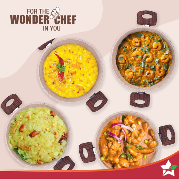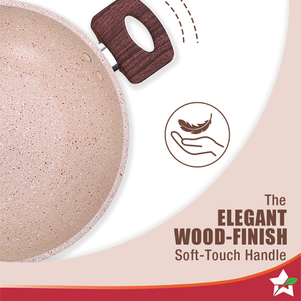 Ergonomically designed, light wood-finish soft-touch handles complement well with Kadhai and lend a comfortable grip.