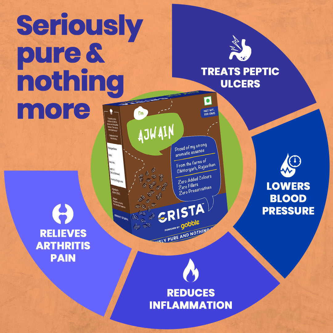 Hey! Its me Ajwain. Proud of: My strong aromatic essence. Premium quality, natural, dry and aromatic CRISTA Ajwain masala is handpicked from the farms of Chittorgarh in Rajasthan. The spice is then transported to the factory where it is sorted, graded and processed. CRISTA Ajwain is sortex grade (implies 99.6% purity), solving one of the common problems of locally available Ajwain which is often adulterated and may possess large amounts of extraneous matter.
