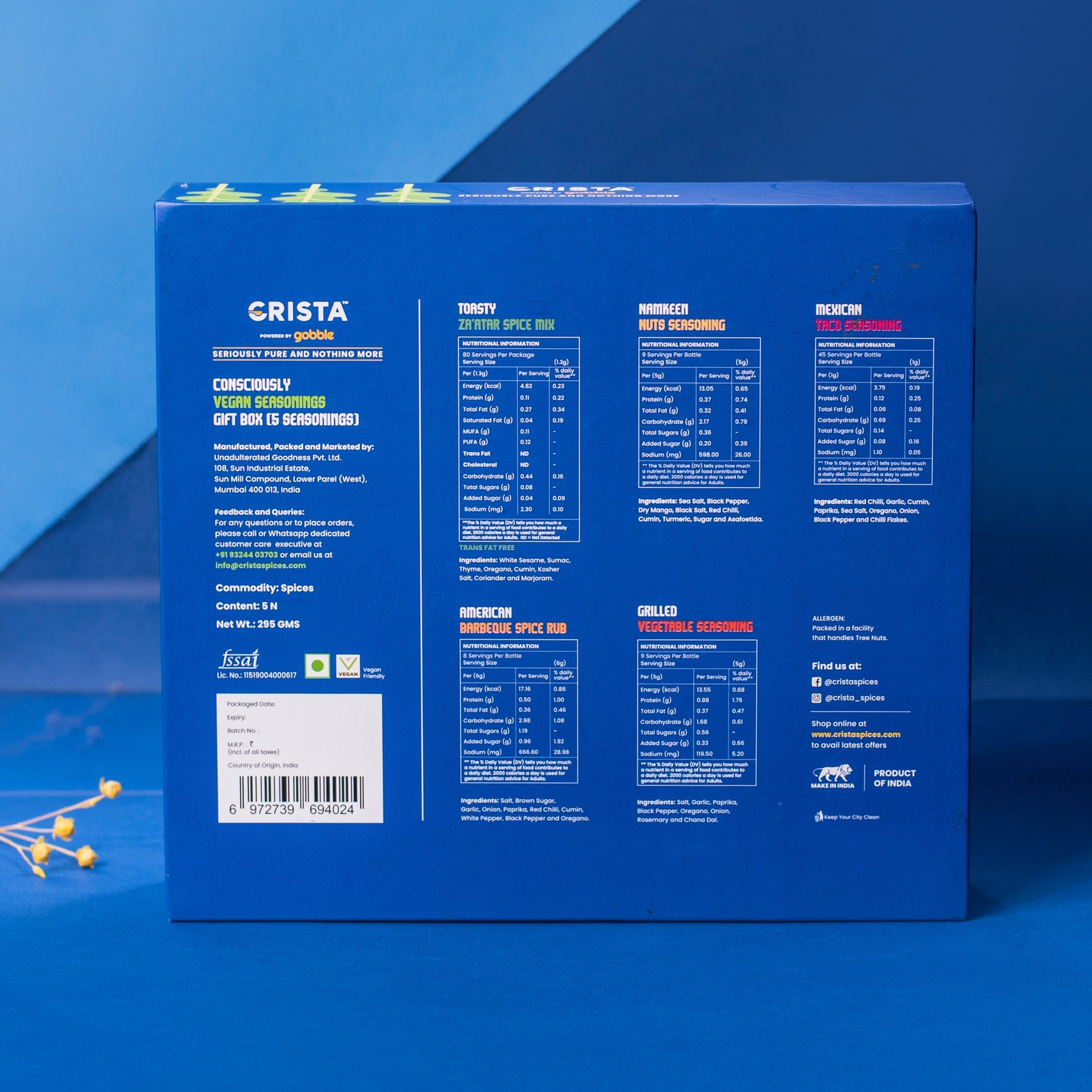 CRISTA Seasonings Gift Boxes are a series of six unique and modern theme oriented gift boxes that consist of a variety of natural, authentic and flavourful Indian and International Seasonings. Baby Showers, Birth Annoucements, Birthdays, Anniversaries, Housewarmings and Festive Occasions like Diwali, Rakshabandhan and Friendship Day are some of the important occasions for which a CRISTA Seasonings Gift Box has been used as the perfect gift to show your appreciation and love towards that special recipient. The Passionately Italian Seasonings Gift Box consists of a modern design, premium packaging and five complex and authentic seasonings and spices that add loads of flavour to any Italian appetizer or entree. Try the earthy yet complex Woody Oregano Seasoning or herb infused Italian Pizza Seasoning for your appetizers or then the very flavourful and delicious Classic Italian Seasoning or Roman Cacio e Pepe Seasoning for pastas. Top of your dish with a judicious use of our signature Smoked Paprika Powder that generates a bit of heat with a lovely smoky essence. The gift box has a product card and note from the 4th generation Founder. Two of the products have a tech enabled QR code offering delectable recipes. CRISTA has pledged 3% of all profits towards various initiatives that empower the families of spice farmers in India.