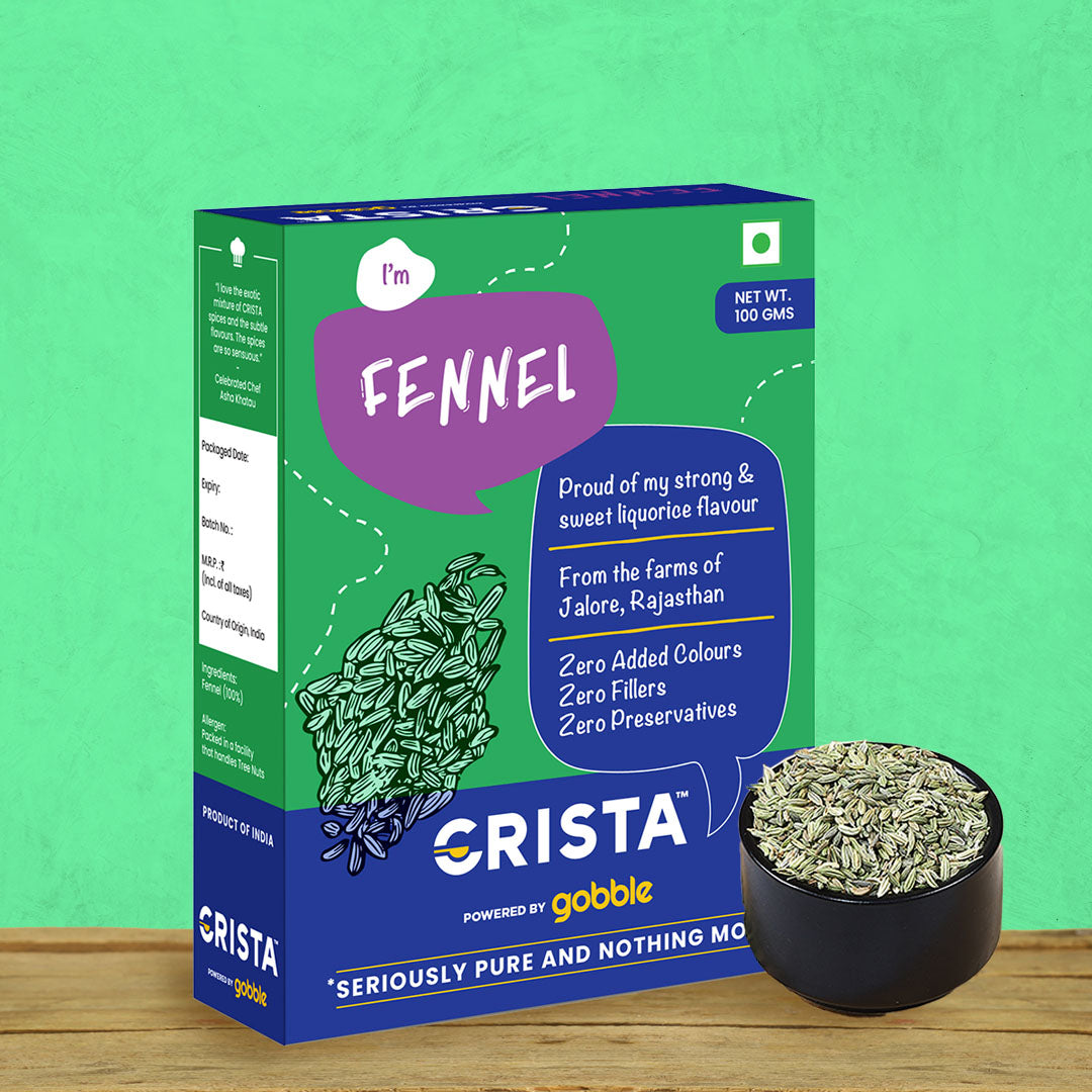 Hey! Its me Fennel. Proud of: My strong and sweet liquorice flavour. Sourced directly from farms in Rajasthan, CRISTA Fennel are premium grade, bold, and greenish in colour. Utmost care is taken in preparing sortex grade (99.6%) purity quality for this spice. Once sourced, the spice is transported to the factory where the seeds are processed, graded and cleaned. Widely used in all kinds of Indian cuisine - savoury and sweet - the spice is an essential in your spice cabinet.