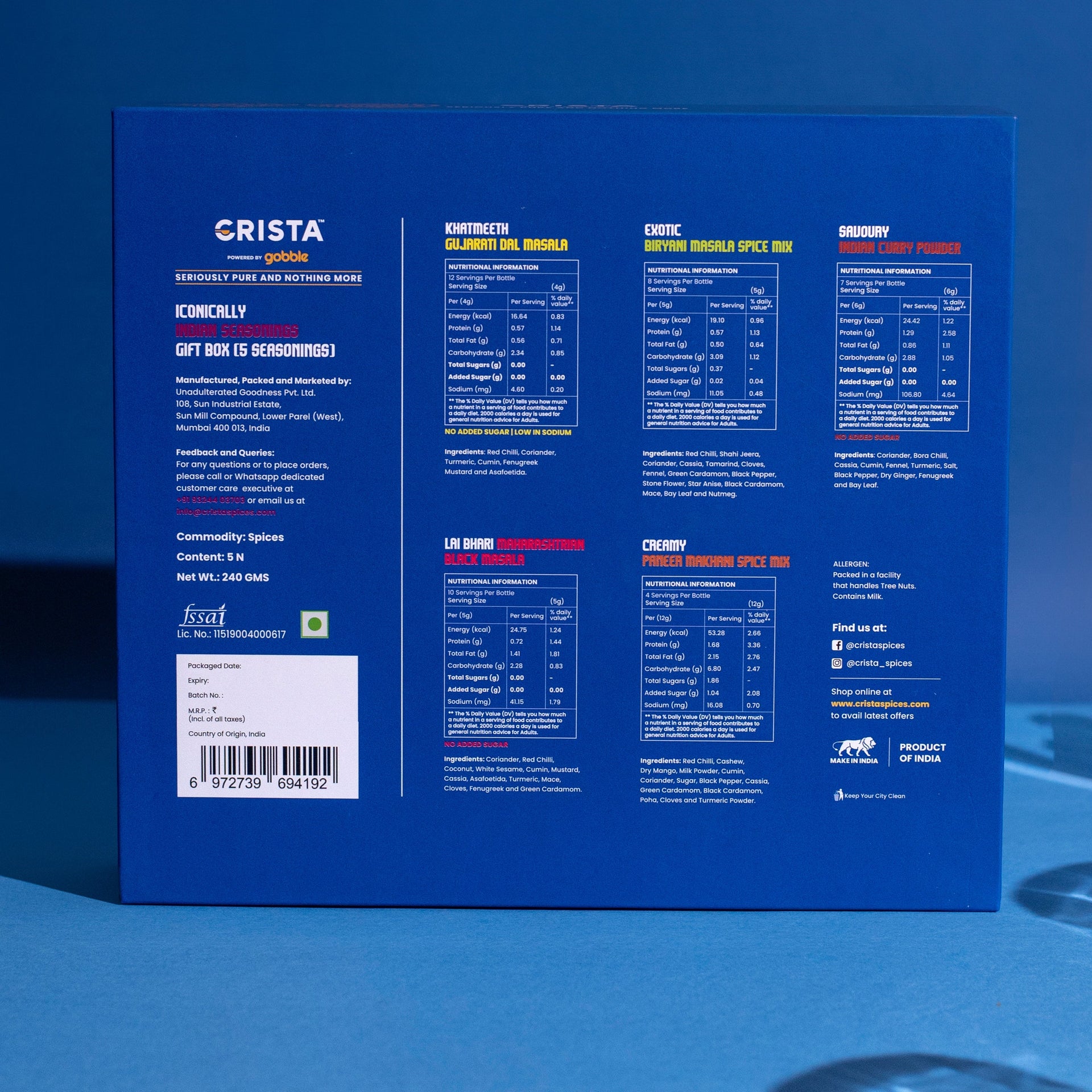 CRISTA Iconically Indian Seasonings Gift Box| Box of 5| Festive Gift| Pure Spice Gifting: 240 gms