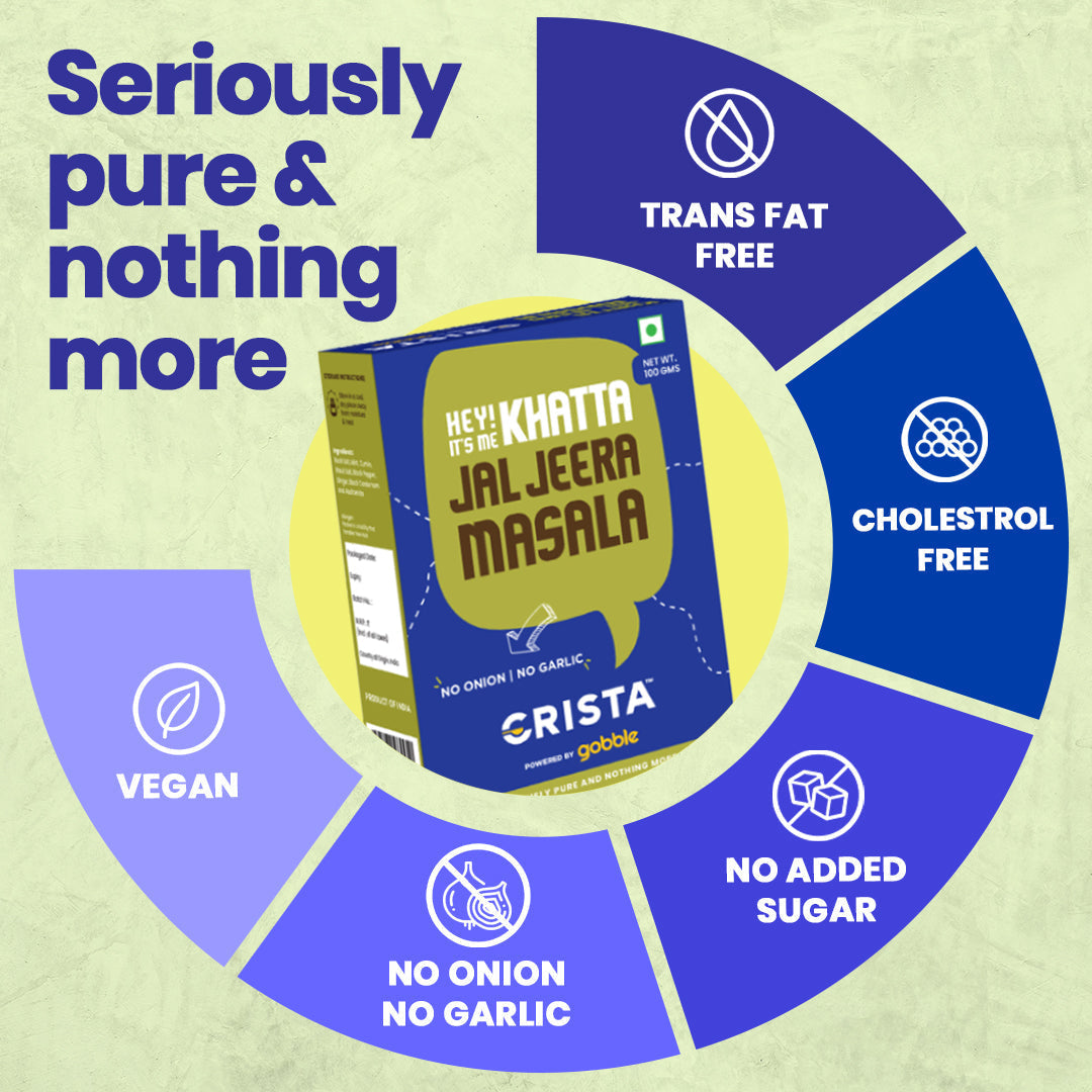 Hey! Its me Khatta Jal Jeera Masala. The Indian climate demands a cooling yet natural concoction to counter the heat, particularly in the summer months. Introducing CRISTA Khatta Jal Jeera Masala â a healthy and flavourful blend of premium whole and ground spices that serve as a great coolant for those hot summer days. Freshly machine ground using our sophisticated hammer crushers and micro pulverisers, the blend is subsequently mixed in an automatic GMP blender to achieve the desired balance and consistency.