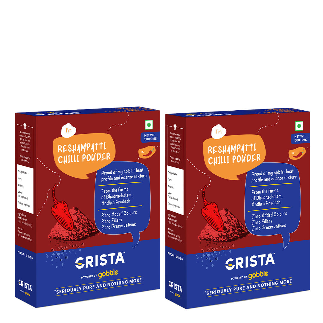 Premium grade, original, pure, natural and sundried indigenous Reshampatti chillis are procured directly from the farms of Andhra Pradesh. Characterized by their pungent taste and high heat value, as measured in Scoville Heat Units of ~35,000-45,000 SHU , the chillis possess a high heat note. These chillis are becoming increasingly popular across many Indian cuisines that require a bit of a kick. Once sourced, the chillis are transported to the factory where they are cleaned and processed before being freshly machine ground into a texturized powder using our sophisticated hammer crushers and micro pulverisers. The final step is mixing in an automatic GMP blender to achieve the desired texture and consistency.