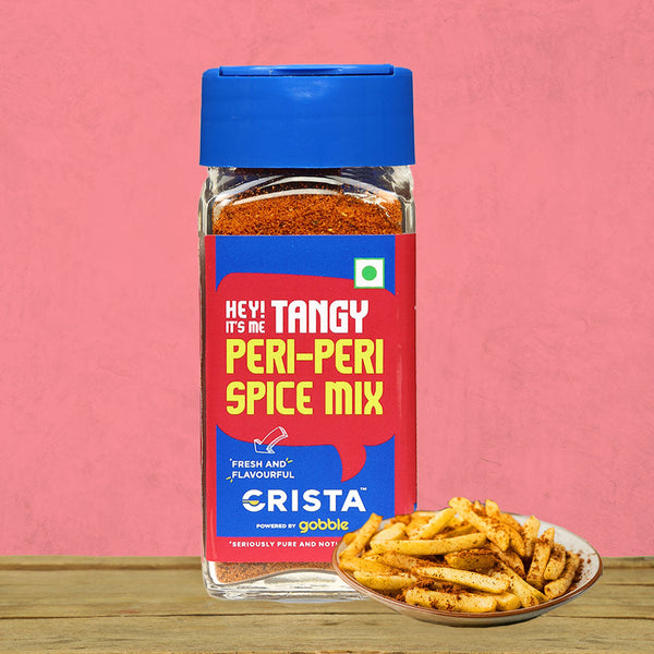 Hey! Its me Tangy Peri-Peri Spice Mix. Team CRISTAâs absolute favourite, this spice blend is inspired by our love for anything tangy, salty, sweet and zingy! Introducing CRISTA Tangy Peri-Peri Spice Mix â the perfect proprietary spice dry blend of coarse, whole and ground premium-grade spices! It pairs perfectly with french fries, burgers, steaks and chicken. The key in this blend is a progression in flavour without any one flavour profile overwhelming the other. Freshly machine ground using our sophisticated hammer crushers and micro pulverisers, the blend is mixed in an automatic GMP blender to achieve the desired balance and consistency. PS â you have got to try our recipe for Peri-Peri sauce.