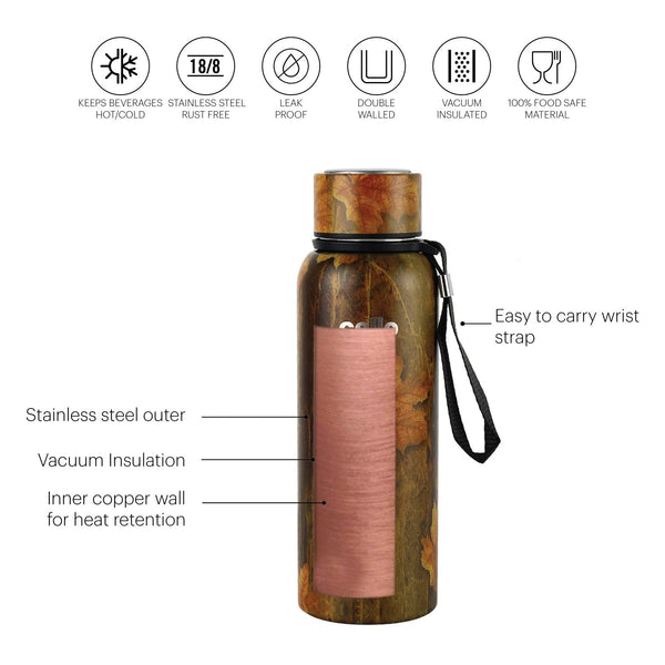 - Vacusteel Technology comes with a double stainless wall with Copper coating on the inside to minimize temperature loss and keep beverages hot or cold for a prolonged period.