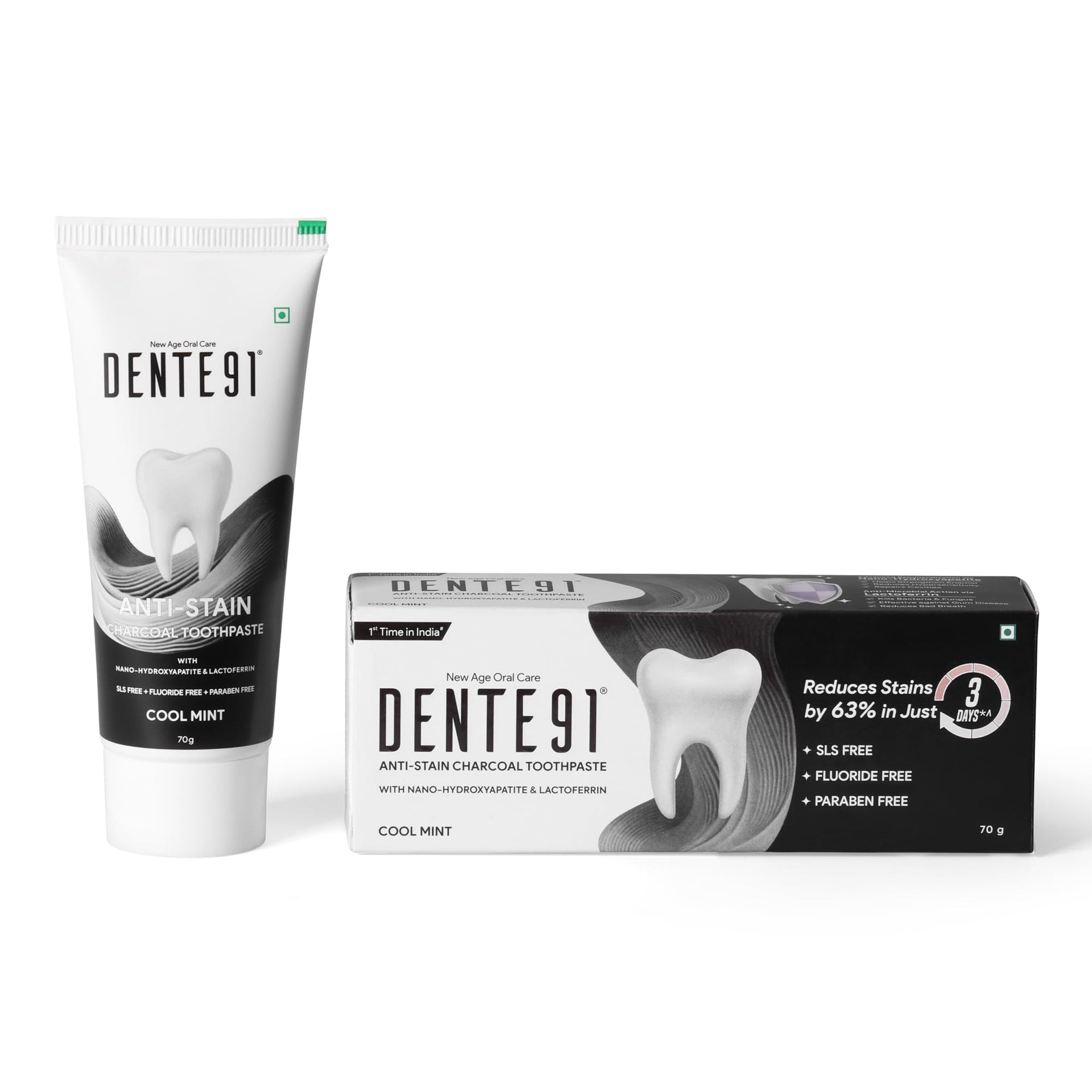 Dente91 Anti-Stain Charcoal Toothpaste for Stain Removal & Teeth Whitening, Protects against Dental Caries & Strengthens Enamel, Reduces 63% stains, Whitens teeth by 80% in just 3 days, 70g