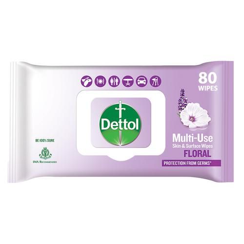 Dettol's disinfecting skin & surface wipes are safe on skin, ideal to clean multiple surfaces, easy to carry with a resealable moisture-lock lid. Dettol disinfecting wipes are practical for everyday use on furniture, fridges, taps, sinks, doorknobs, kitchen, bathroom surfaces, floor cleaning, children’s surfaces and electronics that are germ hotspots. It can be used on most hard, non-porous surfaces including finished wood, sealed marble, stainless steel, laminated floors, glass and plastic. Dettol disinfecting wipes come in two variants and floral.