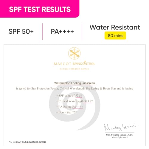 - LIGHTWEIGHT, NON-STICKY, ZERO WHITE CAST FOR ALL SKIN TYPES: Watermelon Hyaluronic Cooling Sunscreen SPF 50 PA+++ is Lightweight, fragrance-free, and colour-free sunscreen with gel cream texture that provides full absorbency with zero white cast and does not clog the pores, suitable for all skin types. Whether you’ve normal skin, dry skin, oily skin, combination skin, or even sensitive skin were safe for you; Paraben-free, Cruelty-free.