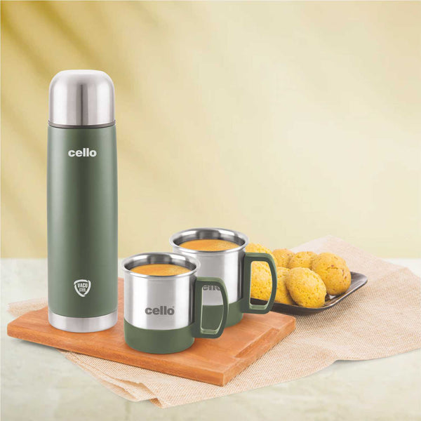 The Cello Duro Classic Vacusteel Flask with Mugs Gift Set features a set of 3 essential pieces for on-the-go convenience. This thoughtfully designed flask and mug combination offers exceptional insulation and durability, keeping your beverages hot or cold for hours. Crafted with premium stainless steel, this set is not only aesthetically pleasing but also built to last.