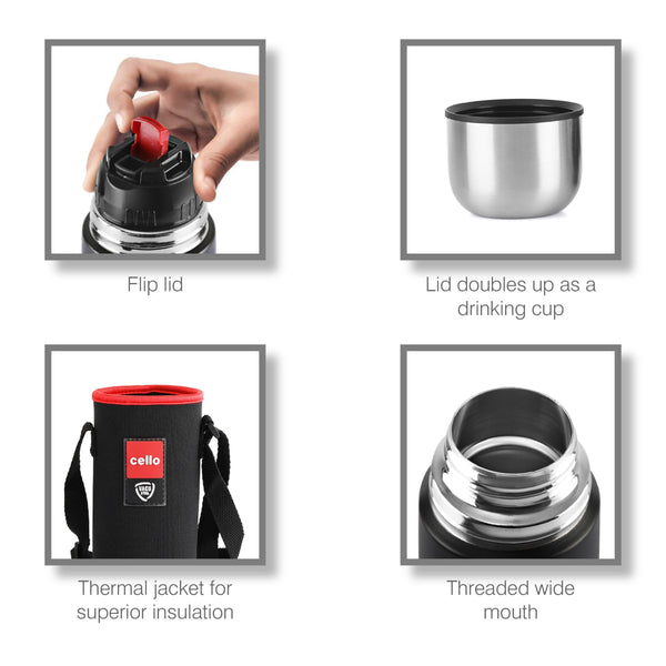 Introducing the Duro Flip Flask, a 500ml Vacusteel Water Bottle with a Thermal Jacket, designed for the adventurous spirit in you. Whether you're heading out on treks, hikes, cycling, going to the gym, school, or the office, this flask is your reliable companion. Crafted with advanced DTP coating, its vibrant colors won't fade or scratch with everyday use, ensuring it looks brand new even with wear and tear. This double-wall insulated water bottle keeps hot liquids piping hot and cold beverages ice cold. The unique DTP coating enhances its appearance, and Vacusteel technology with a copper-coated interior ensures prolonged temperature retention. It's leak-proof, odor-free, and its compact design makes it perfect for an outdoorsy lifestyle, whether you're hiking, trekking, camping, playing sports, hitting the gym, or embarking on other adventures. Carry it with ease in the included pouch and embrace an active lifestyle with a bottle that stands the test of time.