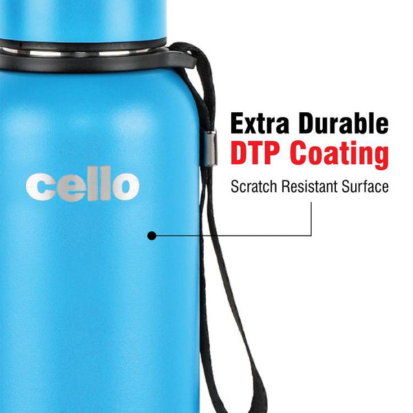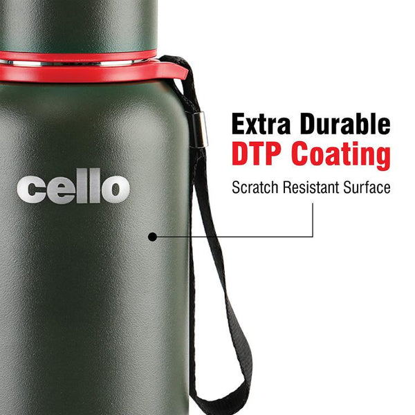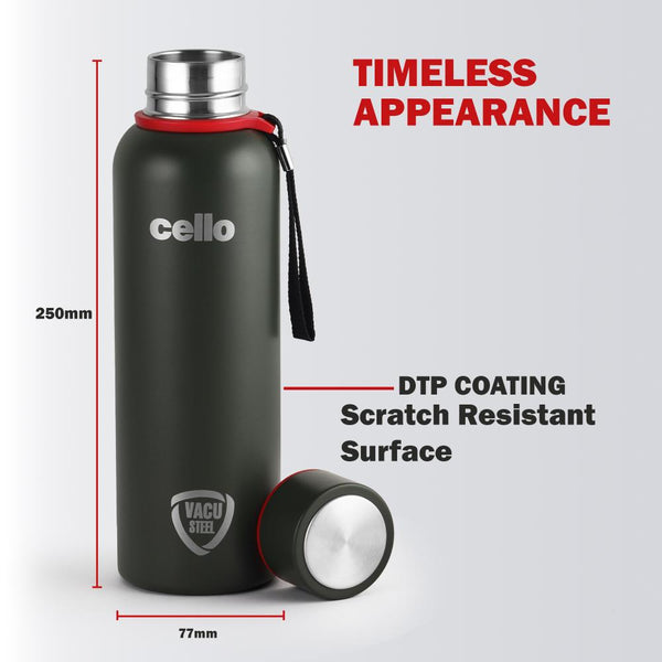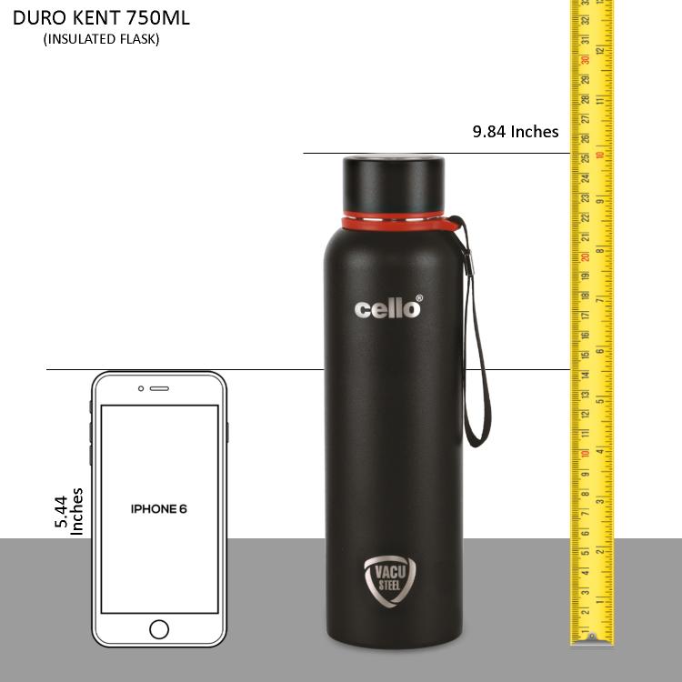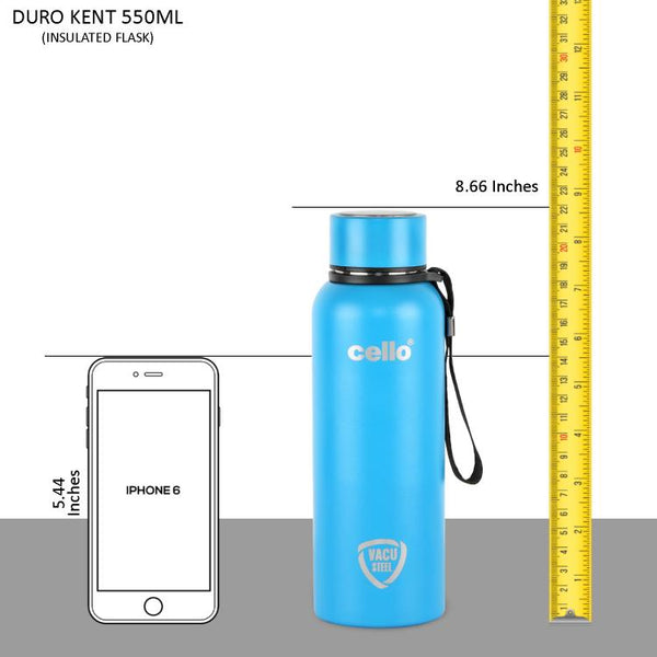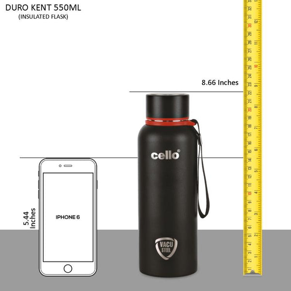 Duro Kent Flask is a Vacusteel Water Bottle from Cello's adventurous Duro Series of Tuff Steel insulated bottles. Designed for those with an adventurous spirit, this flask in sleek black, cool blue, vibrant green, and bold red is the perfect companion for treks, hikes, cycling, gym sessions, school, or office days. Engineered with new and advanced DTP coating, the bottle's vibrant color remains durable, resisting fading or scratching even with daily use. With double-wall insulation and Vacusteel Technology featuring a copper-coated interior, it keeps hot water piping hot and cold water refreshingly cold for extended periods. This leak-proof and odor-free bottle ensures your beverages are stored without oxidation or unpleasant smells, all while remaining rust-free. With a convenient loop for easy carrying, the Duro Kent Flask offers both style and functionality for your active lifestyle. Capacity: 550ml | 750ml | 900ml. Colour - Black, Military Green, Bold Red and Sky Blue
