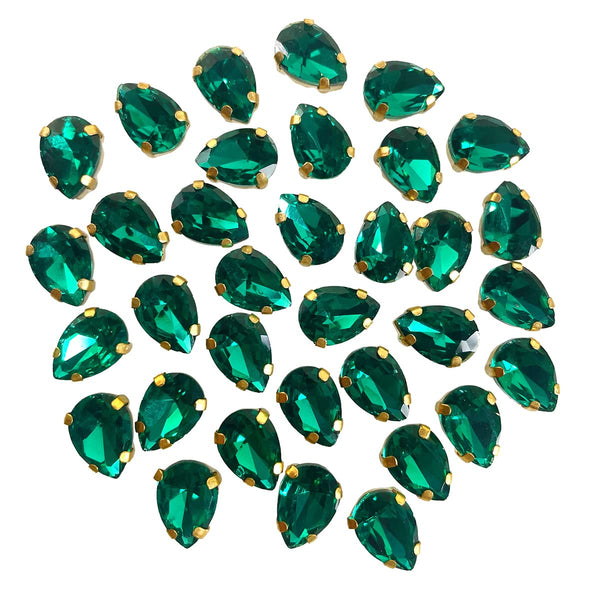 Details: Product Specifications: Style: Sew on Glass Crystal Stone in Setting Color: Emerald Green Size: 7mm x 10mm (approx.) Shape: Teardrop Finish: Shiny Crystal Number of Pieces: 50 Pieces Material of Stone: Crystal-Glass Material of Holder: Brass