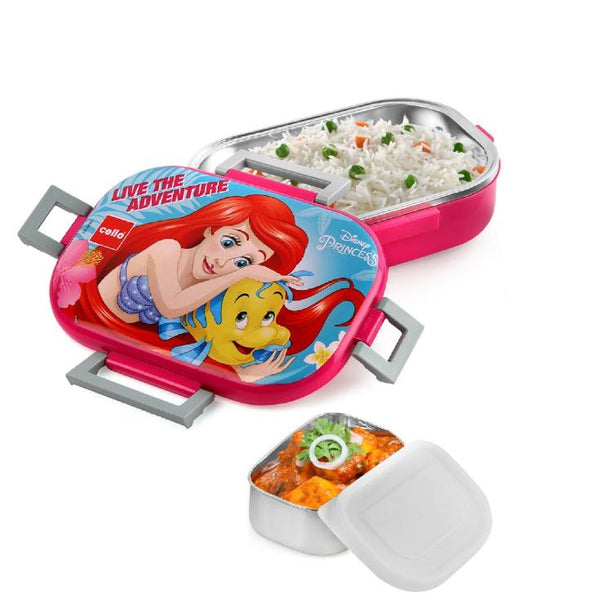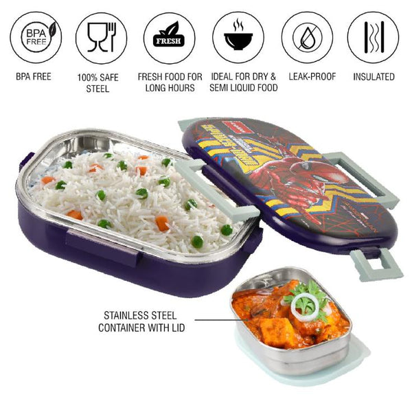 Introducing the Feast Deluxe Insulated Lunch Box for Kids with exciting designs like Spiderman, Little Mermaid and Tinker Bell. Our lunch box is designed to delight both parents and kids, ensuring meals are not only delicious but also fresh. The set includes a small steel container nestled inside, alongside convenient clip locks, guaranteeing a leak-proof experience. Crafted from high-quality stainless steel, this insulated lunch box keeps food irresistibly fresh for extended periods. Made with 100% food-grade, virgin plastic that's BPA-free, ensuring safety with every bite. Dishwasher safe for added convenience. Available in vivid Red, Pink and Purple making lunchtime an adventure every day!
