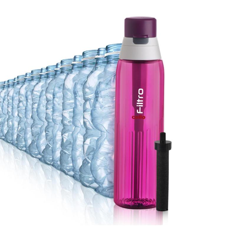 Hydrate and filter in style! The Cello Premium Filtro bottle has a replaceable carbon filter that removes the taste and odor of chlorine from potable tap water. Made from BPA-free plastic, this stylish water bottle is suitable for your everyday life. Available in many colors. Rehydrate & replenish anywhere, anytime with Cello Filtro Water Bottle With Activated Carbon Filter. It makes potable tap water, stream water & even rain water safe to drink. Its ideal for school going kids, travelers, hikers & everyone who likes to go camping, trekking etc.