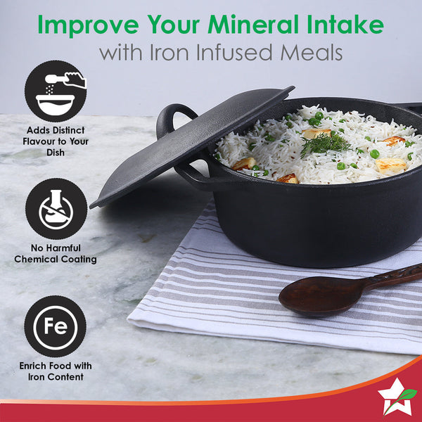 - Make restaurant-style food or even traditional home-style food in these Cast-Iron casseroles. Heavy Cast-Iron retains & transfers heat evenly for the best Biryanis, Dum, Koftas, and Curries. So now your food is power-packed with rich flavours. The Cast-Iron material is very durable and hence makes it a timeless product.
