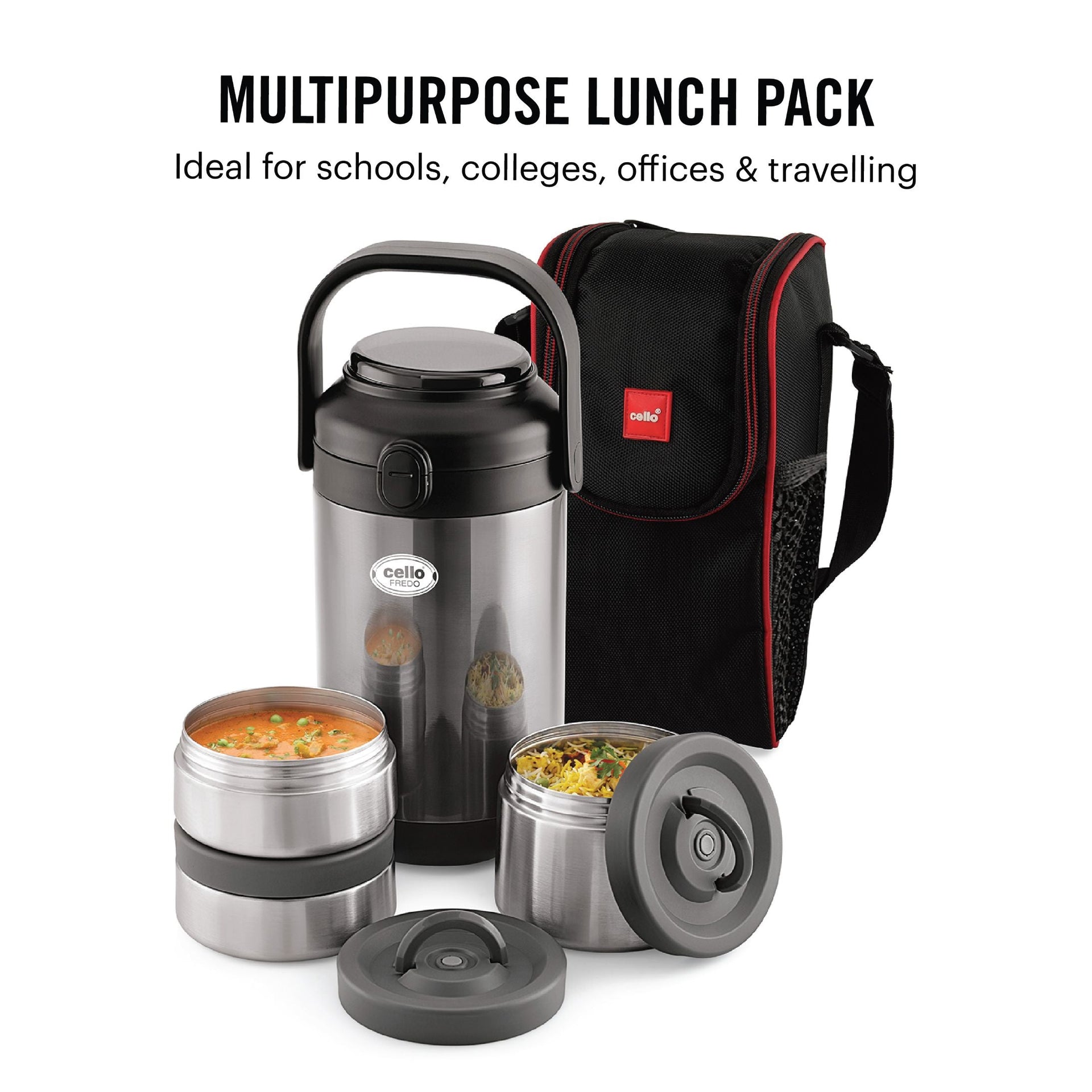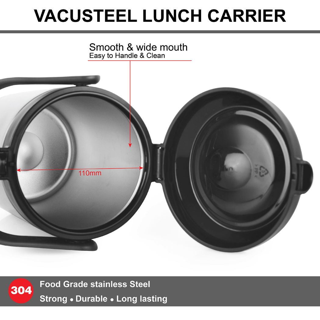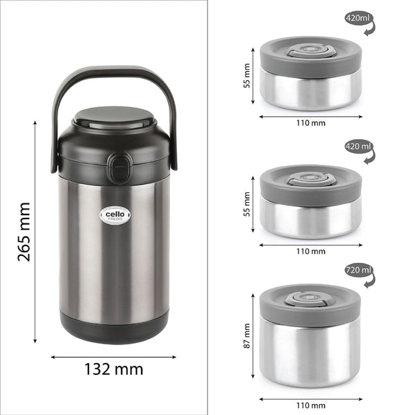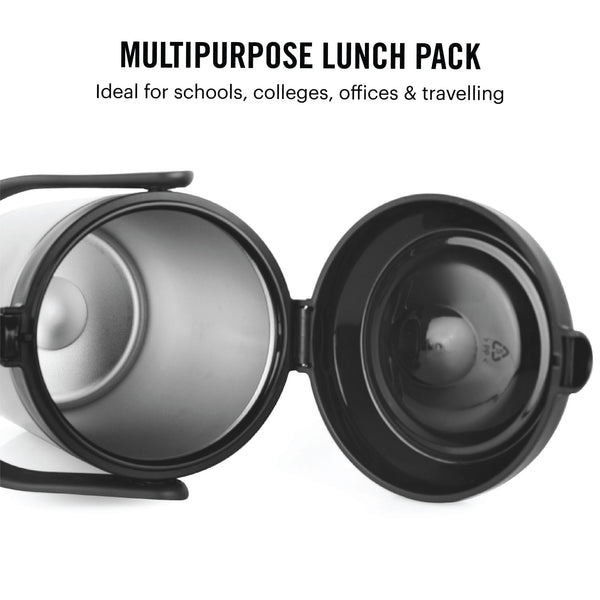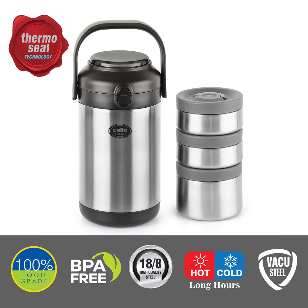 Introducing the Fredo Double Walled Insulated Lunch Box, a set of three exceptional lunch carriers designed for those who appreciate the warmth and freshness of homemade meals on the go. These leak-proof containers are perfect for carrying a variety of dishes, from dals to sabjis, and they are tough, sturdy, and crafted from 100% food-grade materials that won't affect the taste or aroma of your food. The airtight, silicone-sealed lids lock in freshness and moisture, preventing spills. Moreover, the double-walled insulation keeps your food fresh for extended periods. With its easy-to-clean stainless steel construction and convenient size, it effortlessly fits into briefcases, school bags, or handbags, making it a reusable and durable solution for all your meal-carrying needs.