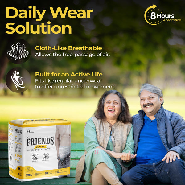 Friends Classic Adult Diapers Pants Style - 30 Count (Double Extra Large) with odour lock, Unisex, Leakproof, Elastic Waist and Anti-Bacterial Absorbent Core - Waist Size 34-65 Inch; 86-165 cm