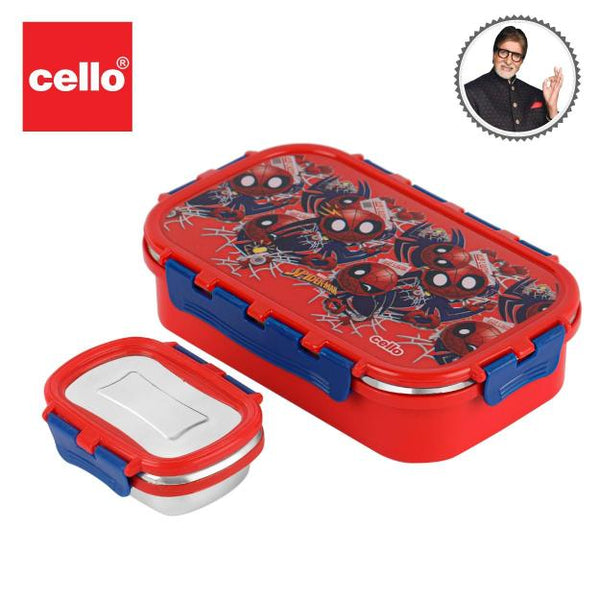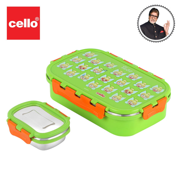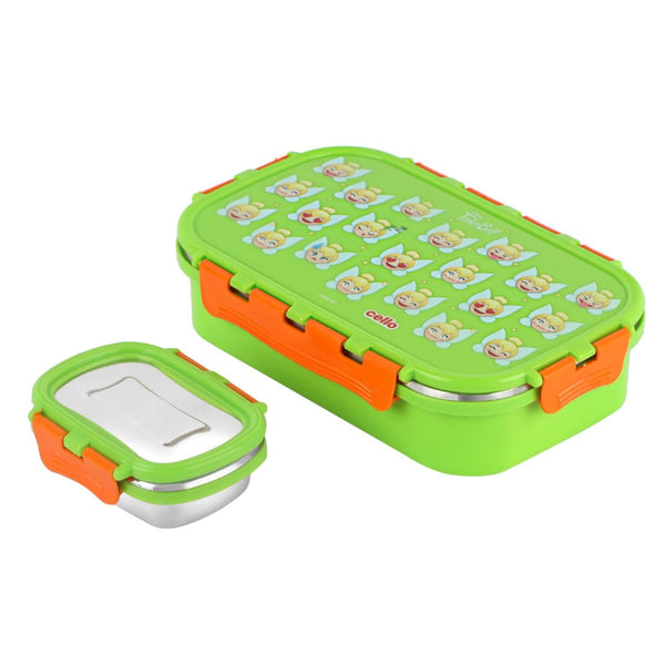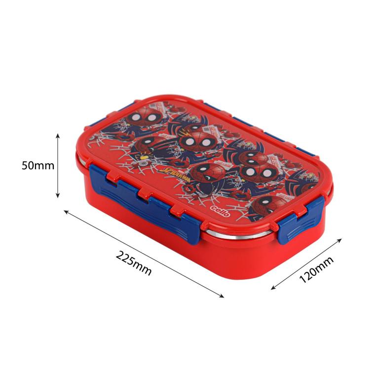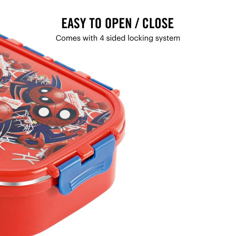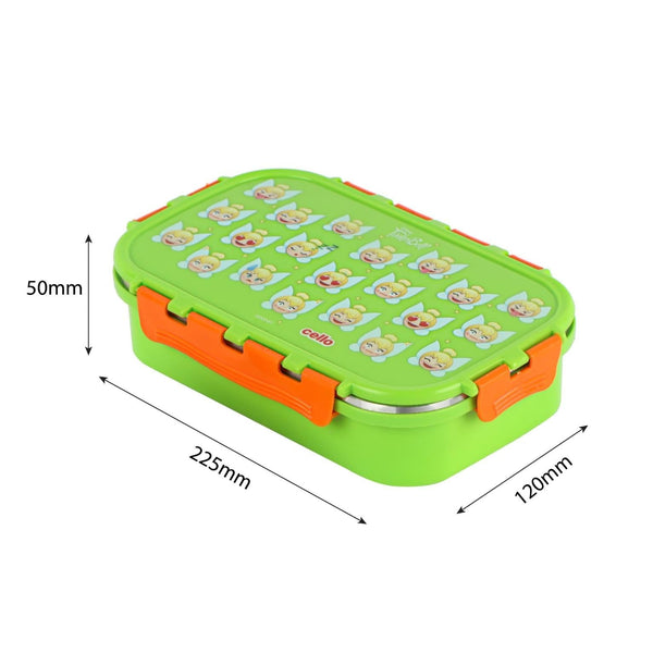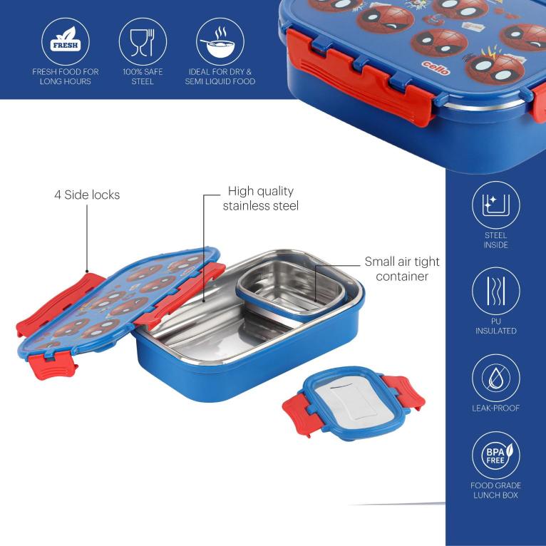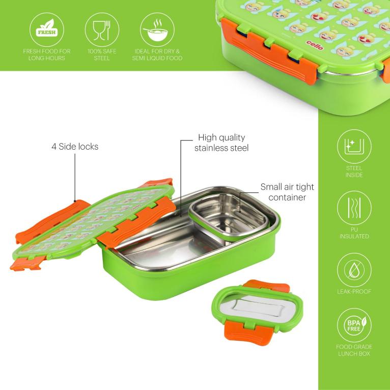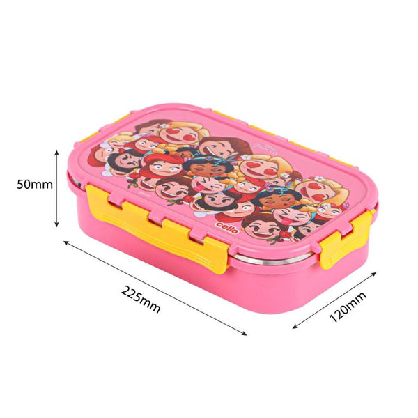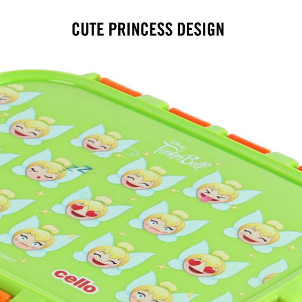 Introducing the fun food insulated lunch box from Cello Kidzbee, a lunchtime companion that's perfect for kids! This big-sized lunch box features delightful Emoji style Disney Princess, Spiderman and Tinker Bell prints that kids will adore. Crafted with care, its inner compartment is made of sturdy stainless steel, while the outer layer is BPA-free plastic. Designed in charming colours, it's easy to carry, fitting effortlessly into backpacks. The lunch box comes with secure side locks and an airtight lid, keeping meals fresh and mess-free. Inside, a leakproof steel container awaits, ready to hold savory gravies and tasty curries. Ideal for school, picnics, and adventures, it's both safe and fun!