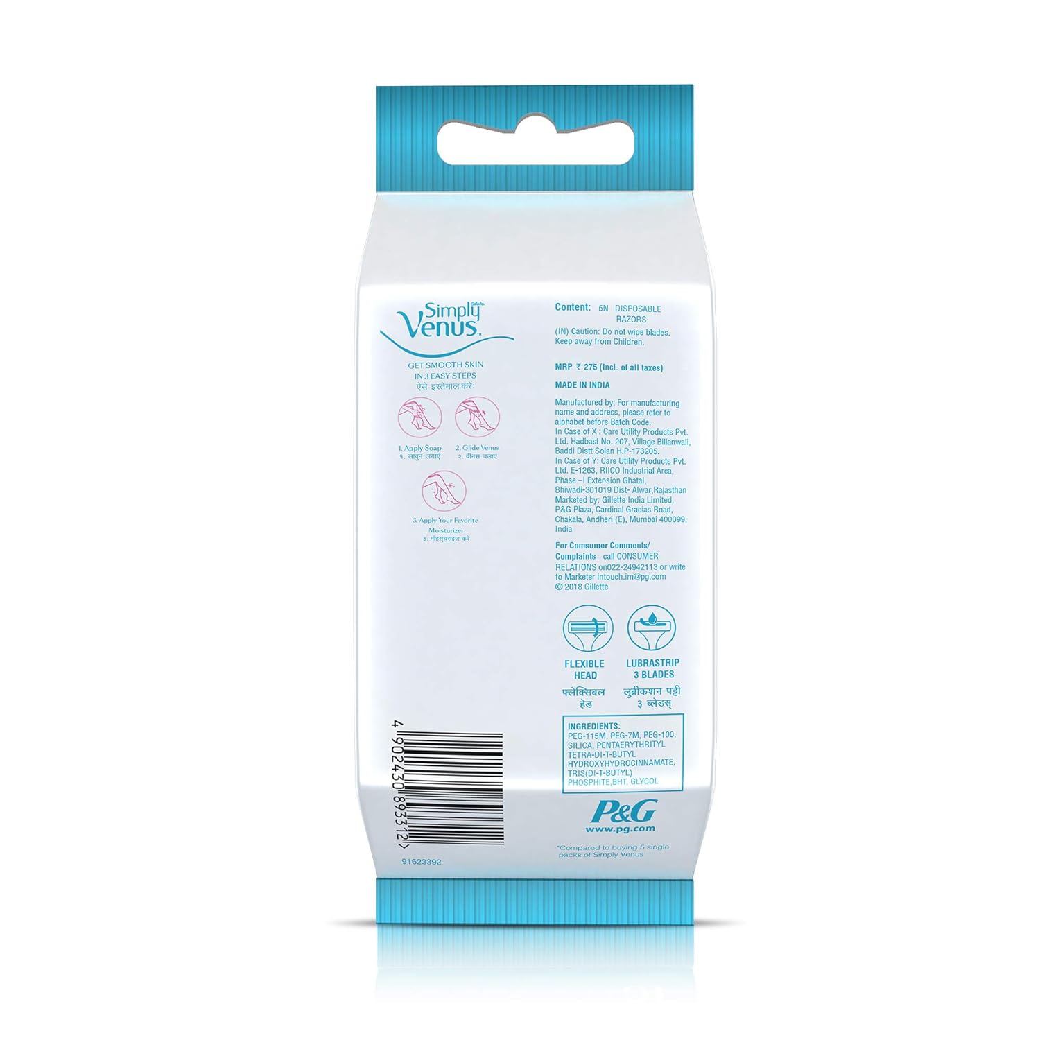 Introducing Gillette Venus Simply Venus Pink Hair Removal for Women. With a glide strip infused with aloe vera extracts, 3 blades for smooth skin, and a flexible head that effortlessly follows your curves. Enjoy easy grip with a rubber handle for comfortable use in the shower. Maximum Shelf Life: 36 Months.