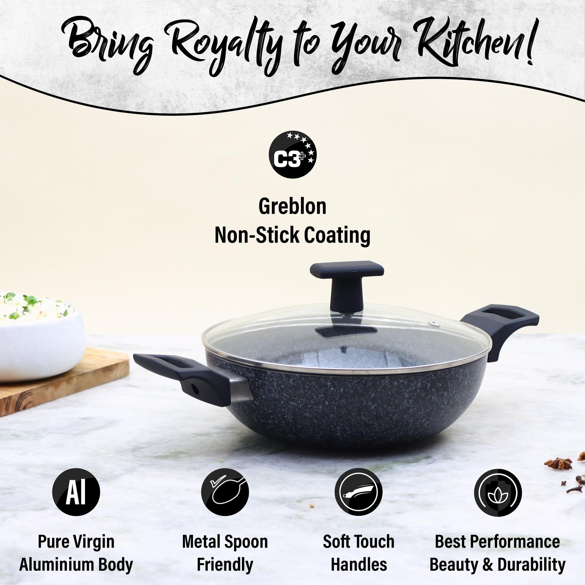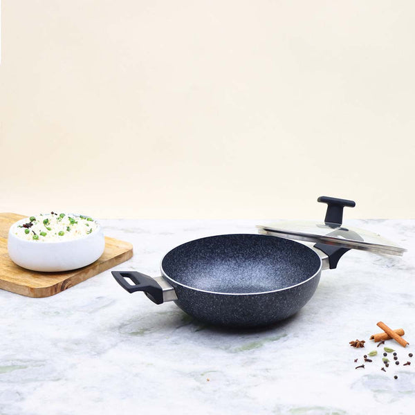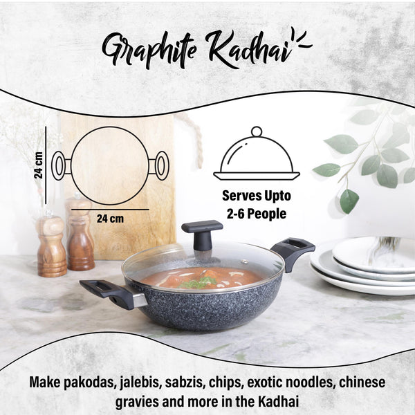 Enjoy the pleasant cooking experience with the all new Graphite non-stick cookware range. Featuring a beautiful stone finish with German non-stick coating from Greblon; the fry pan, grill pan, kadhai, dosa tawa and casserole will add beauty to your kitchen. Graphite range is made from pure grade virgin aluminium which is 9 times beer conductor of heat than steel. Now you can freely use a metal spoon without the fear of scratches on the coating. The so-touch handles provide a comfortable grip. Time to cook healthy, stay fit and get stellar performance everytime you cook with Graphite range of non-stick cookware by Wonderchef.