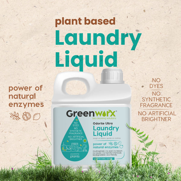 Details: Odorite Ultra Laundry Liquid is a multi-enzyme detergent liquid which offers superior cleaning performance, at low temperatures. Our laundry detergent liquid is the only one in INDIA that contains six enzymes, each offering maximum stain removal (even on complex stains). Phosphate free, eco friendly, acid free, caustic free, hypoallergenic, 100%biodegradable, no harmful chemicals, non-toxic, baby safe, no fading, no bleach, extremely effective, all - around stain removal and whitening effect , at low temperature - Proven to remove the following stains ; Candy , chocolate , coffee , tea , deodorants , dirt , fruit juice , grass , gravy , ink , tomato sauce , lipstick , oil , pet stains , pollen, poop , salsa, wax , wine and more - Highly cost- effective - environment friendly, sustainability- enhancing solution at low temperatures - Safe , non-toxic and environment friendly - Plant based surfactant we believe it is possible to have effective, natural and safe cleaning products that don't cost the earth. Net Volume - 1 Liter