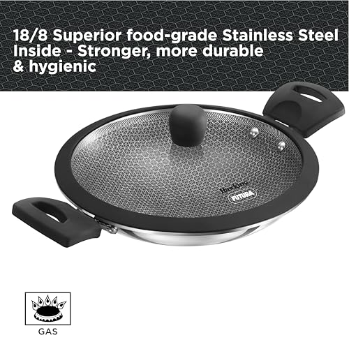 Details: Hawkins Triply Stainless Steel Appachatty is crafted with the PFOA-free nonstick coating shielded by stainless steel ridges. This allows you to use metal spatulas without causing damage and also ensures less wear and tear, ultimately extending the lifespan of your pan. The extra-thick 3 mm tri-ply construction ensures superior heat retention and even cooking. The superior food-grade 18/8 stainless steel interior is hygienic, stronger and more durable. Designed with curved sides, the pan is well-suited for deep-frying and stir-frying, offering versatility. The Round Bottom enhances convenience during stir-frying. Perfect for preparing a range of dishes, the Appachatty excels in crafting Appam, Upma, Akuri, Poha, Firni, Bengal Fish Curry, Stir-Fried Bean Sprouts and Vegetables, Samosa, Egg Curry, and Kadai Masala Chicken. The see-through, toughened heat-proof glass lid locks in flavour and moisture. Suitable for domestic gas stoves.
